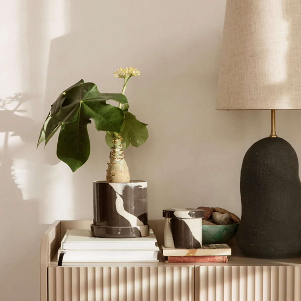 Der Inlay Steinzeug Behälter von Ferm Living sticht durch seine zweifarbige Optik in jeder Einrichtung hervor. Durch die Tonmischung entsteht ein grosses marmorähnliches Muster, das jedes Stück zum Unikat macht. Der Behälter in Brauntönen ist individuell einsetzbar. Von der Aufbewahrung von kleineren Dingen auf dem Schreibtisch, über trockene Lebensmittel in der Küche, bis hin zur Verwendung als dekorativer Blumentopf. Inlay ist in jeden Raum eine praktische Ergänzung.