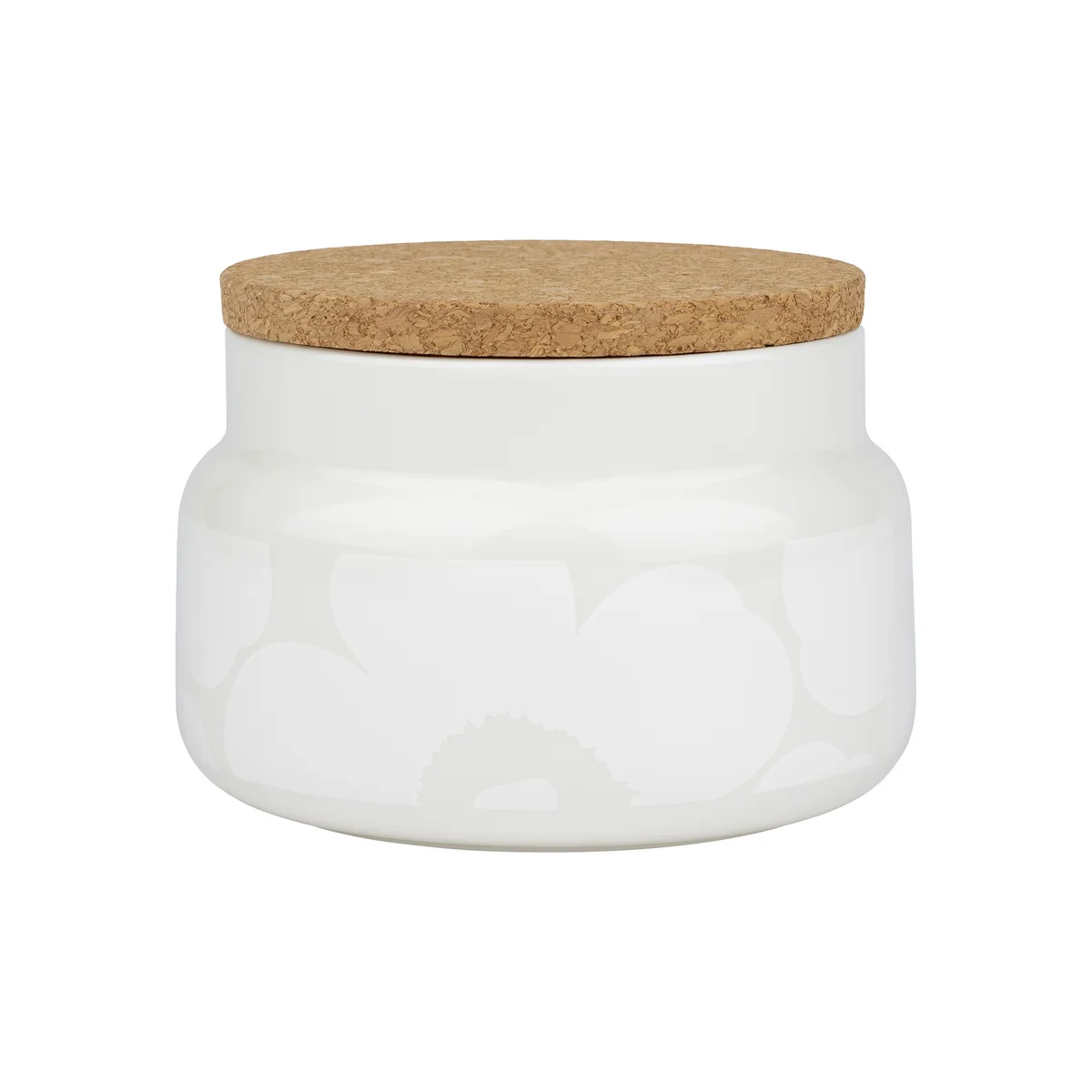 Die Oiva Unikko Aufbewahrungsdose aus dem finnischen Hause Marimekko besticht mit ihrem floralen Muster und den edlen Details. Die Dose mit einem Fassungsvermögen von 700 oder 1200 ml wird aus weissem Steingut mit goldenen Metallpigmenten gefertigt. Die Dose ist mit einem Korkdeckel versehen, der auf der Innenseite mit dem Marimekko-Logo verziert ist.