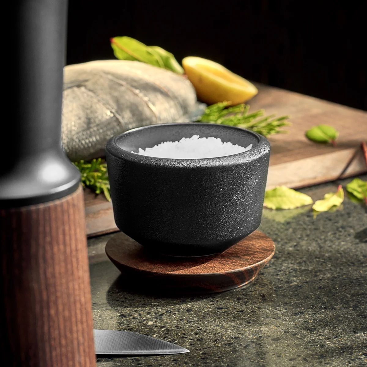Die RÅ Salzschale mit Deckel von Rosendahl zeichnet sich durch eine scharfkantige Ästhetik aus, die für einen stilsicheren Look in der Küche sorgt. Die Schale selbst besteht aus schwarzem Steingut, während der Deckel aus wärmebehandelter - und daher so dunkler - Esche besteht.