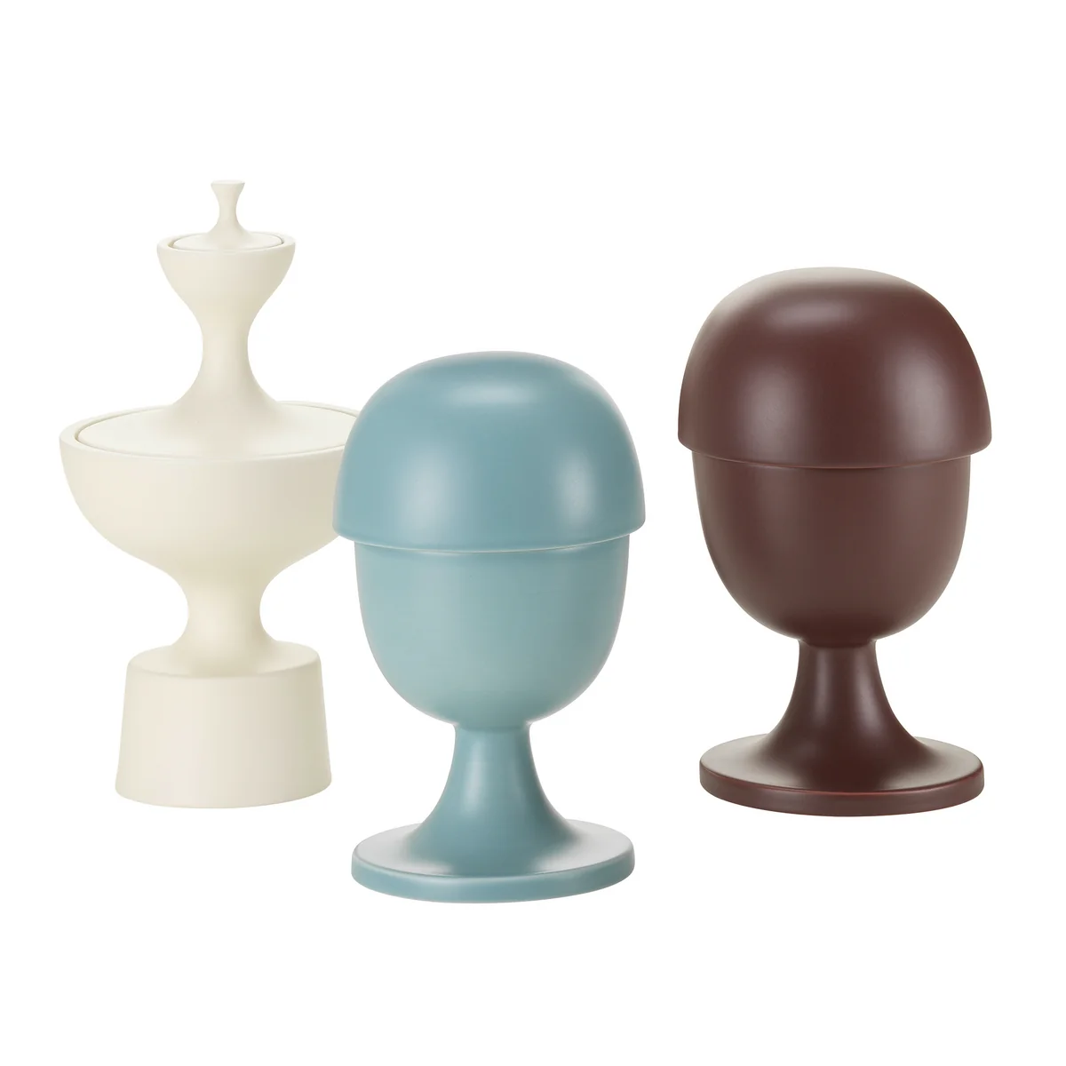 Der Entwurf stammt vom amerikanischen Architekten Alexander Girard, der die Gefässe 1952 eigenhändig aus Holz drehte. In Zusammenarbeit mit der Familie Girard hat das Schweizer Studio Vitra nun die Gefässe aus Keramik neu aufgelegt.