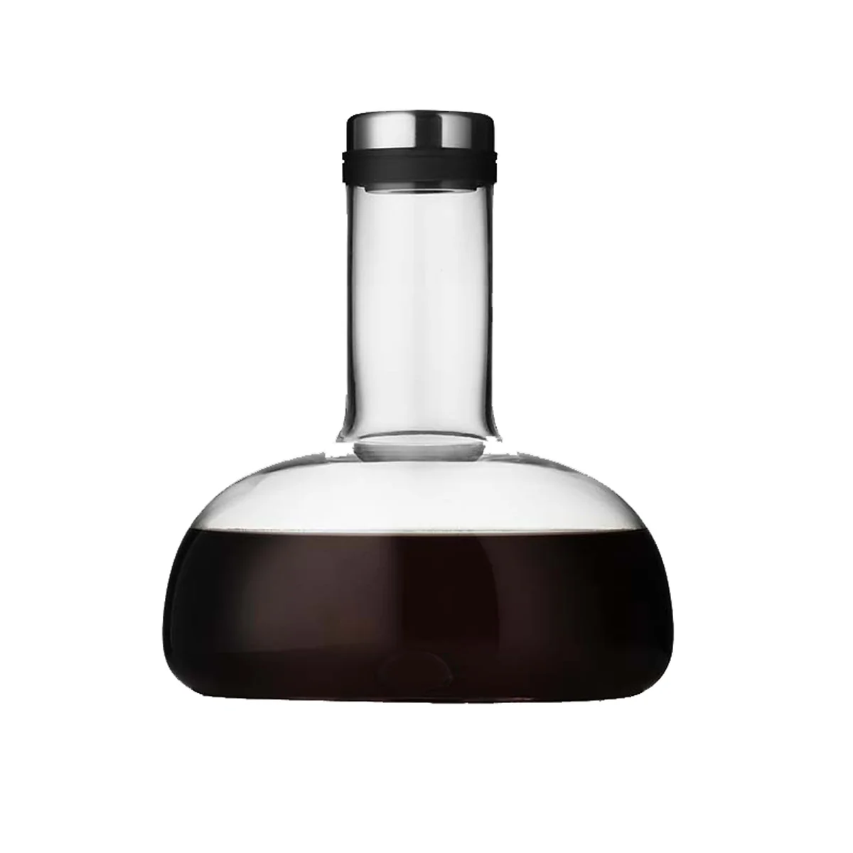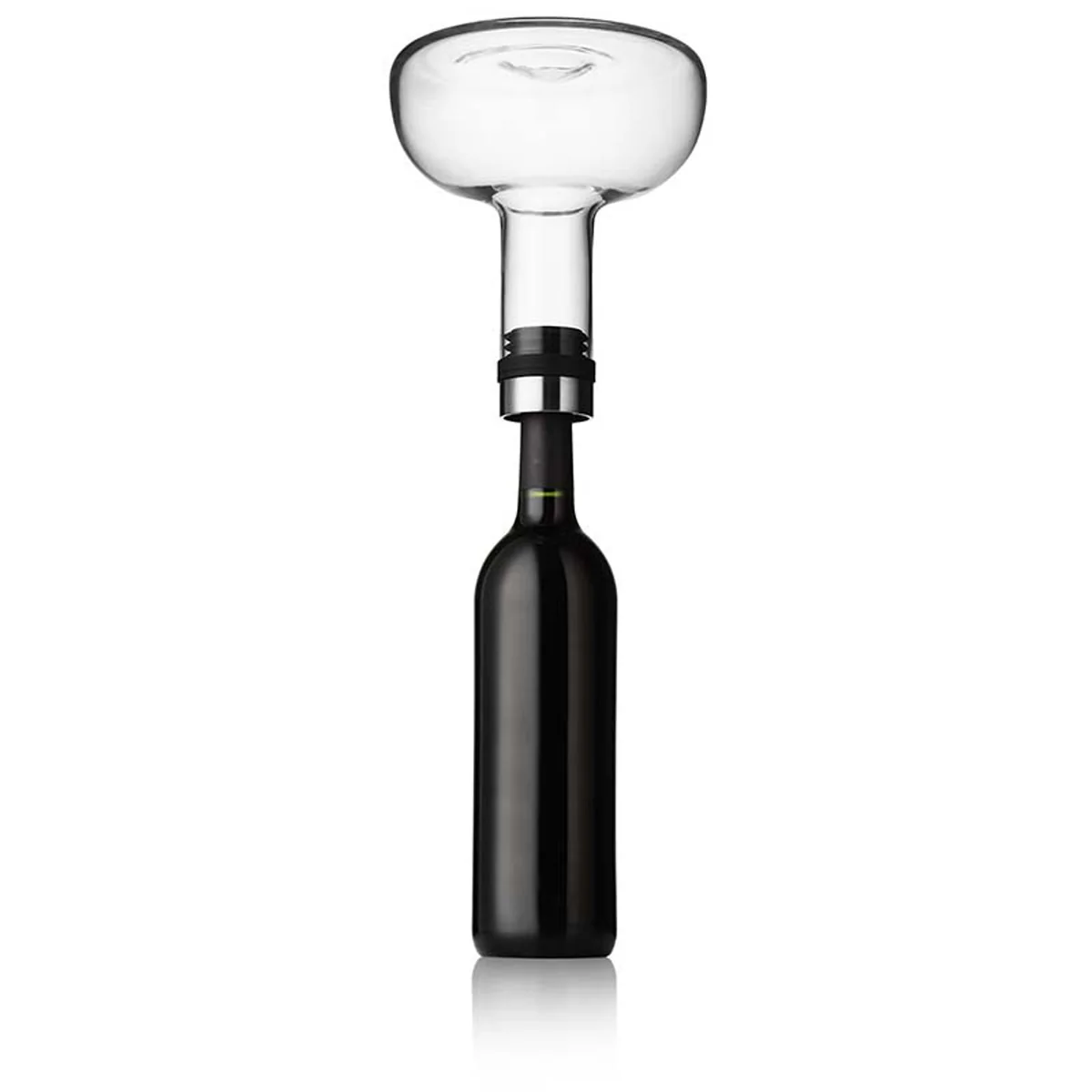 Eine geöffnete Flasche Wein wird über dem Wine Breather mit einem Fassungsvermögen von 1 l platziert und beides umgedreht. Der Wein läuft nun aus der Flasche durch die grosse Öffnung in die perforierte Karaffe, wodurch der Wein perfekt belüftet wird. Serviert werden kann der Wein in der eleganten Karaffe oder in seiner eigentlichen Flasche, dafür muss die Kombination aus Dekanter und Flasche nur noch einmal umgedreht werden und der Wein fliesst tropffrei in die Flasche zurück. Dabei wird er zusätzlich ein zweites Mal mit Sauerstoff versorgt.