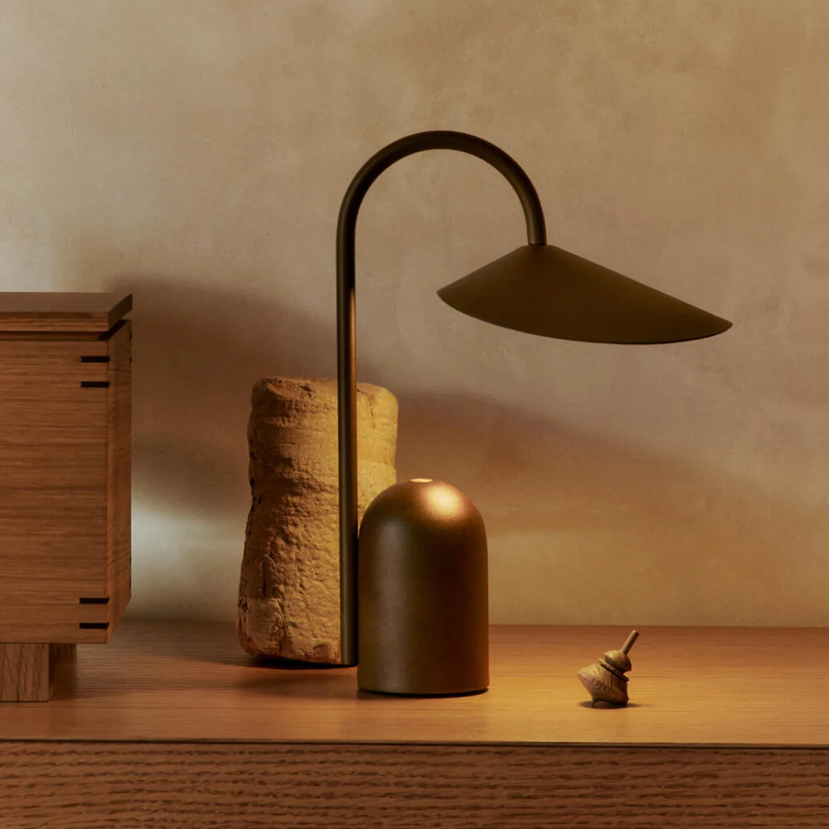 Die Arum Akku LED-Tischleuchte aus dem Hause Ferm Living zeichnet sich durch ihren massiven Marmorsockel aus, der mit einem organisch geformten Lampenschirm kombiniert ist. Der Marmorsockel, der ein harmonisches Gleichgewicht in seinem aussermittigen Design schafft, gleicht die anmutige Aufhängung des Lampenschirms an einem gebogenen Metallbogen aus, der an ein Blatt erinnert. Das matte Innere der Leuchte spendet ein sanftes, gleichmässiges Licht, und der verstellbare Lampenschirm sorgt für eine optimale Beleuchtung in jeder Umgebung.