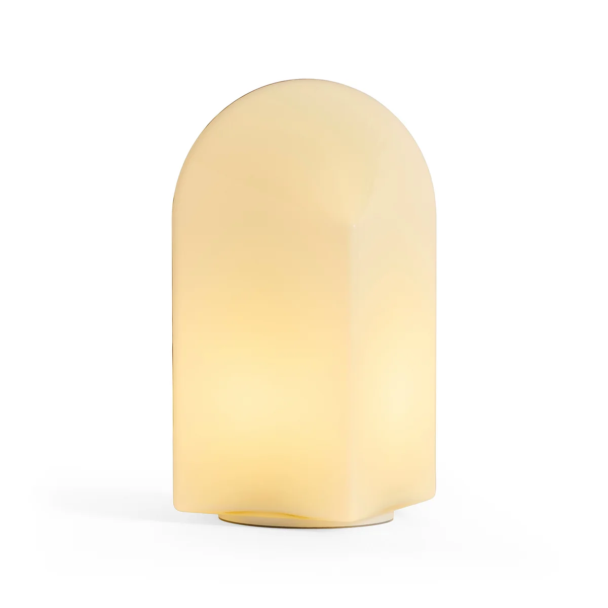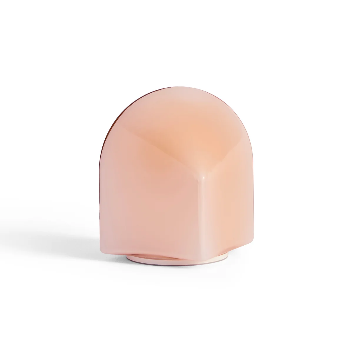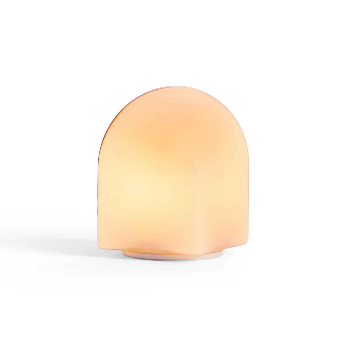 Die Parade Portable Tischleuchte von HAY, entworfen von Viola Heyn-Johnsen und Jonas Trampedach, vereint skulpturales Design und Funktionalität. Mit ihrer geometrischen Form, bestehend aus einer quadratischen Basis und einem gewölbten Oberteil aus farbigem Glas, verändert die Leuchte ihre Wirkung je nach Blickwinkel.