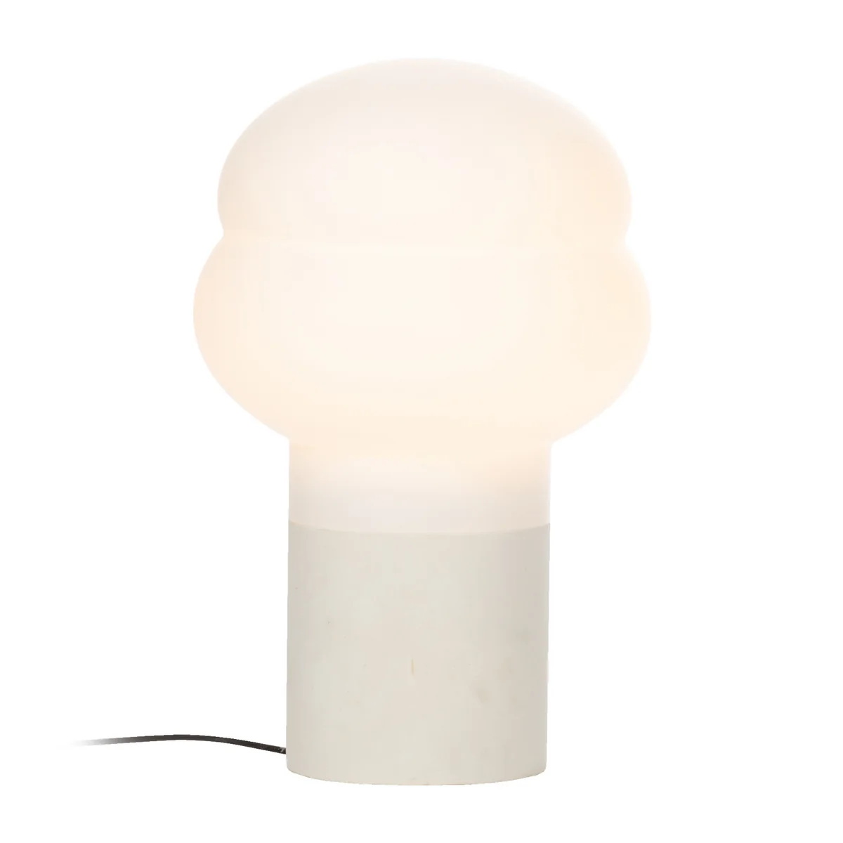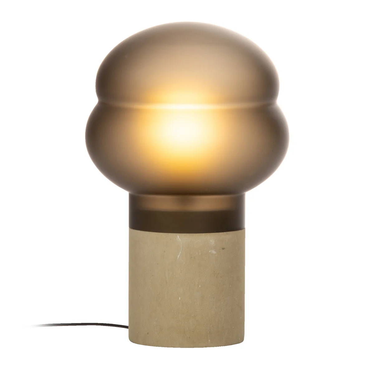 Die Leuchte besteht aus einem runden Leuchtenschirm aus mundgeblasenem Glas. Jeder Schirm ist ein absolutes Unikat und kleine Unebenheiten oder Abweichungen sind ein Zeichen für traditionelles Handwerk. Der Sockel der Leuchte aus Kalkstein ist farblich auf den Schirm abgestimmt und lässt so einen harmonischen Gesamteindruck entstehen.
