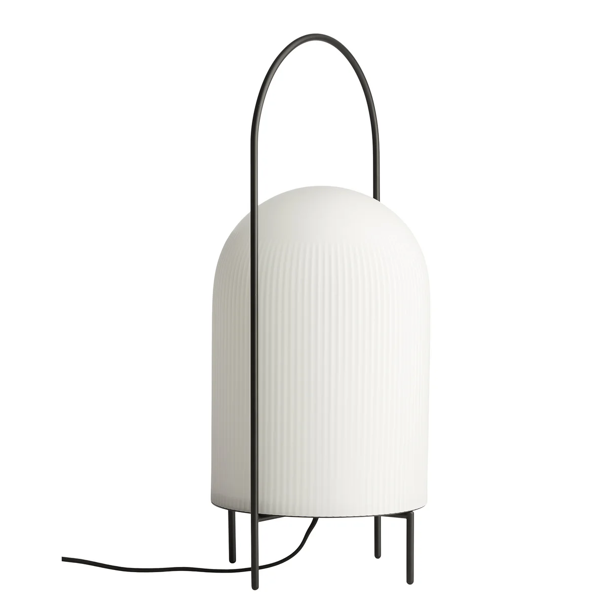 Die Ghost Bodenleuchte des dänischen Herstellers Woud ist eine moderne Interpretation der antiken, tragbaren Öllampen. Der Leuchtenschirm wird von einem schlanken Metallstab umschlossen, während der überhängende Bügel als Tragegriff zum Transportieren genutzt werden kann. Der Ghost-Schirm wird aus lichtdurchlässigem Opalglas gefertigt und erweckte den Eindruck als sei ein weisses Tuch über die Lichtquelle geworfen. Der Leuchtenschirm erinnert mit seiner Optik an einen schwebenden Geist. Die Oberfläche ist mit einem subtilen, vertikal verlaufenden Rillenmuster versehen. Das Kabel der Ghost Bodenleuchte ist mit einem Dimmschalter ausgestattet.