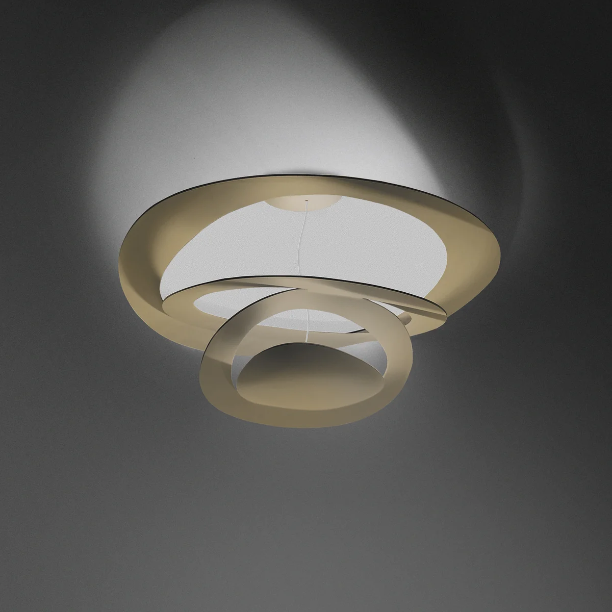 Mittig strahlt das Licht gegen die kunstvoll geschwungenen Ringe, die als Reflektor dienen und das Licht sanft, gleichmässig und blendfrei im Raum streuen. So entsteht eine indirekte Beleuchtung, die für eine wohlige und einladende Atmosphäre in jedem Raum sorgt.