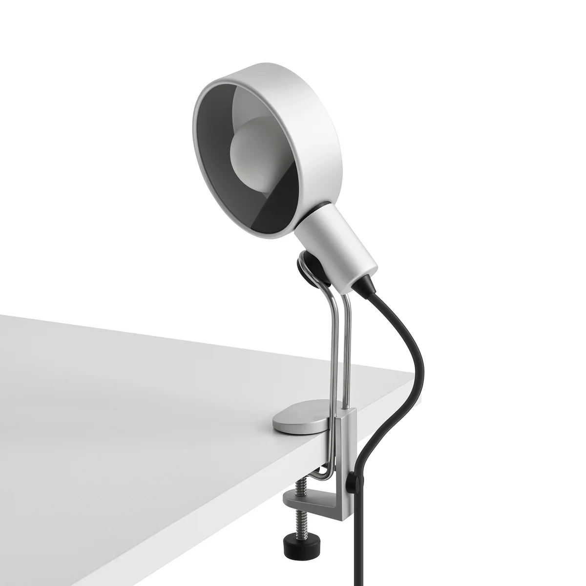 Die Leuchte ist aus robustem Aluminium mit naturfarbener Eloxierung gefertigt und kombiniert einen rohen, industriellen Look mit markanten, abgerundeten Linien. Dank ihres flexiblen Designs kann sie an Regale, Schreibtische und andere Oberflächen geklemmt werden, um lokalisiertes, gerichtetes Licht für verschiedene Bedürfnisse zu liefern.