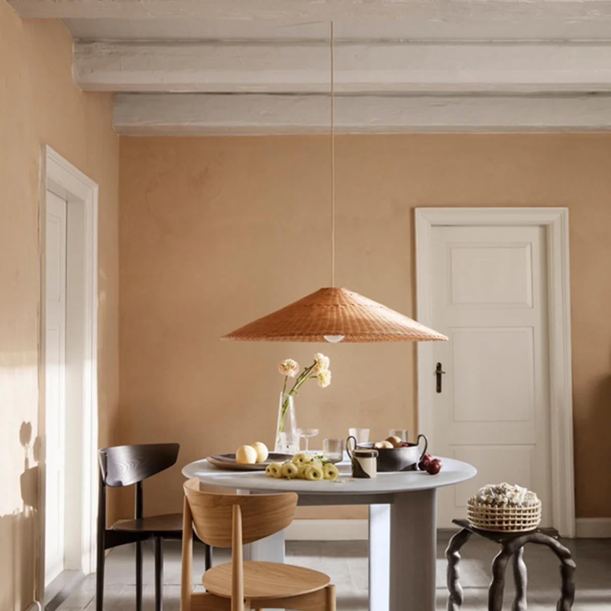 Mit der natürlichen Farbgebung des Rattan, fügt sich der Dou Rattan Lampenschirm von Ferm Living harmonisch in den Raum ein und erzeugt warme Akzente. Die Duo-Serie spielt mit dem Gegensatz zwischen geometrischen Formen und den organischen, strukturellen Eigenschaften des Materials. Der Lampenschirm sorgt für eine optimale strahlende Beleuchtung im Raum, lässt aber durch das handgeflochtene Rattan auch kleine Lichtblicke hindurch. Der Duo Lampenschirm kann wunderbar als Deckenleuchte im Wohnzimmer oder als Leuchte über dem Esstisch fungieren. Egal wo - der Rattanschirm von Ferm Living zieht garantiert die Blicke auf sich.