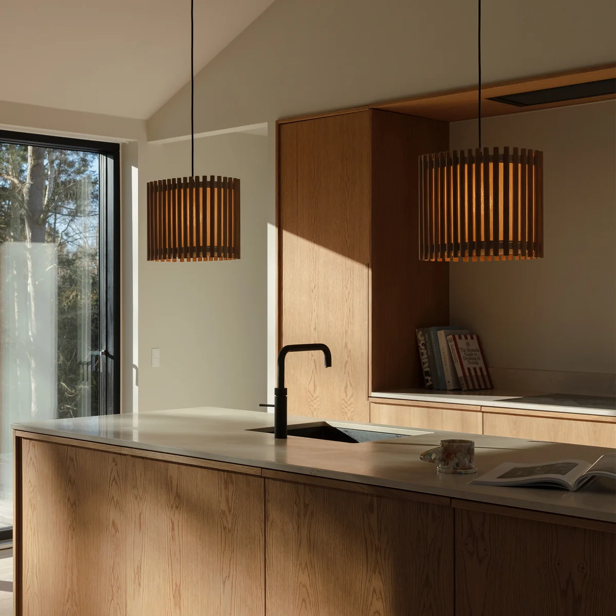 Der Komorebi Leuchtenschirm besticht durch sein von der Natur inspiriertes Design. Die organisch geformten Elemente erinnern an Blätter oder Zweige, die sanft das Licht filtern und eine natürliche Lichtatmosphäre erzeugen.