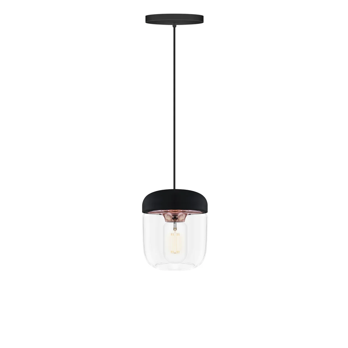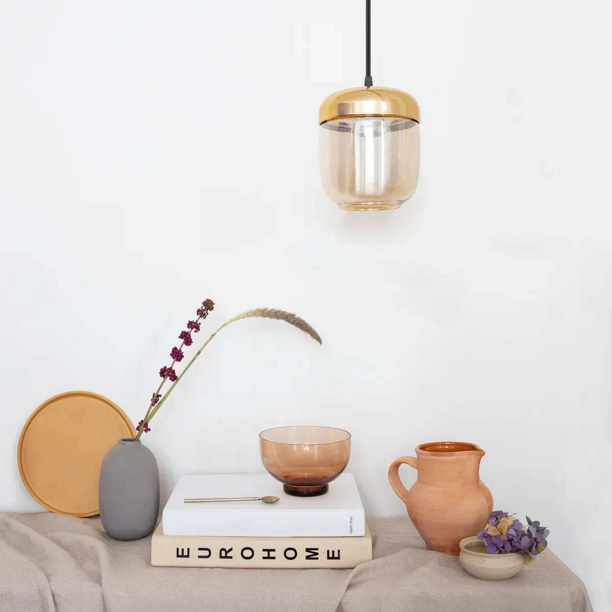 Eine Eichel besteht aus drei Teilen: einer weichen Schale, einer Kappe und einer Nussfrucht im Innern. Ähnlich dazu ist auch die Pendelleuchte von Umage aufgebaut: Eine glatte, äussere Schale aus Glas wird an einer Seite von einer Schale umschlossen. Im Inneren begeistert die Acorn Leuchte mit einem metallischen Finish in Kupfer, Stahl oder Messing.