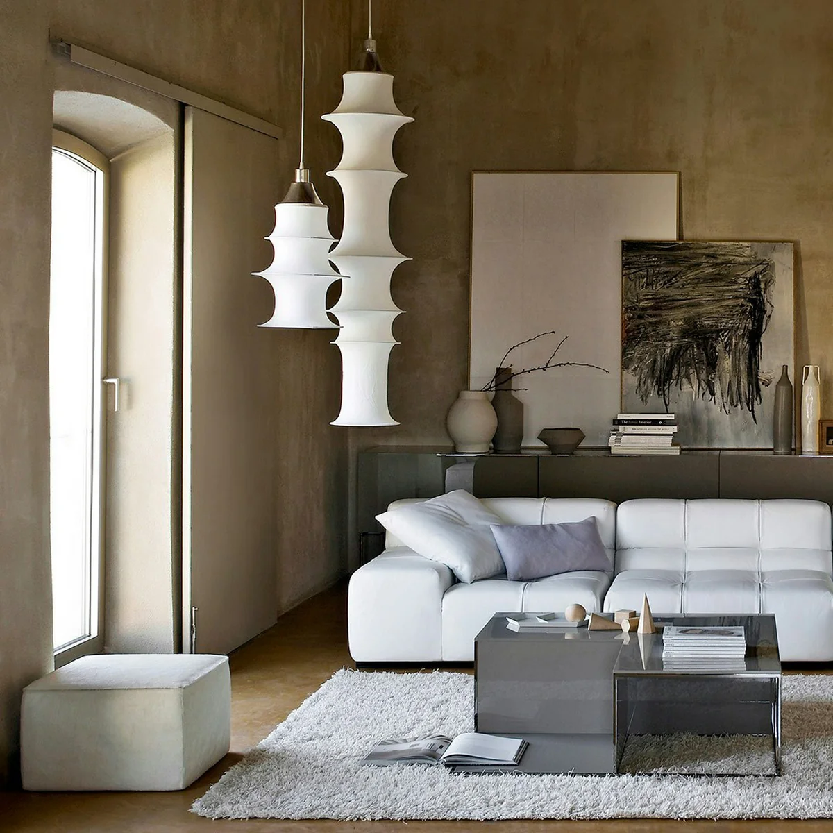 Die Falkland Pendelleuchte, entworfen von Bruno Munari, ist eine ikonische Leuchte, deren Form durch das Wechselspiel von Stoff und Metall entsteht. Der gespannte Gewebeschlauch und die Metallringe erzeugen eine organisch-fliessende Silhouette, die im Raum schwebend wirkt.