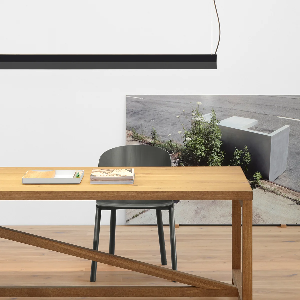Die Span Pendelleuchte, entworfen von Michael Raasch im Jahr 2014, besticht durch ihre schlichte Eleganz und ihre hohe Funktionalität. Die x-förmige Leuchte ist an zwei Befestigungspunkten ausbalanciert und leitet das Licht effizient auf die darunter liegende Tischfläche, während sie gleichzeitig ein angenehmes Lichtambiente für die Decke erzeugt, ohne zu blenden. Diese Eigenschaften machen sie ideal für den Einsatz über Ess- und Arbeitstischen. Mit zwei integrierten Diffusoren sorgt die Span Pendelleuchte für blendfreies Licht, besonders bei einer empfohlenen Höhe von 650 mm über der Tischfläche. Die Leuchte kann durch externe Zusatzgeräte wie einen DALI-Konverter in Smart-Home-Systeme integriert werden, um eine intelligente Lichtsteuerung zu ermöglichen.