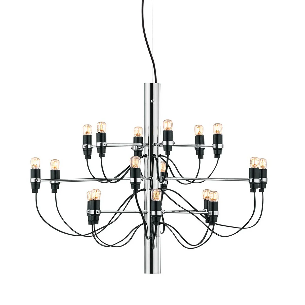 Der 2097 Kronleuchter wurde bereits 1958 von Gino Sarfatti entworfen und ist eine moderne Interpretation des klassischen Kronleuchters. Ein Stahlrohr in der Mitte verbirgt die von den Glühbirnen ausgehenden Stromkabel, die für das schwungvolle und dennoch schlichte Design sorgen.