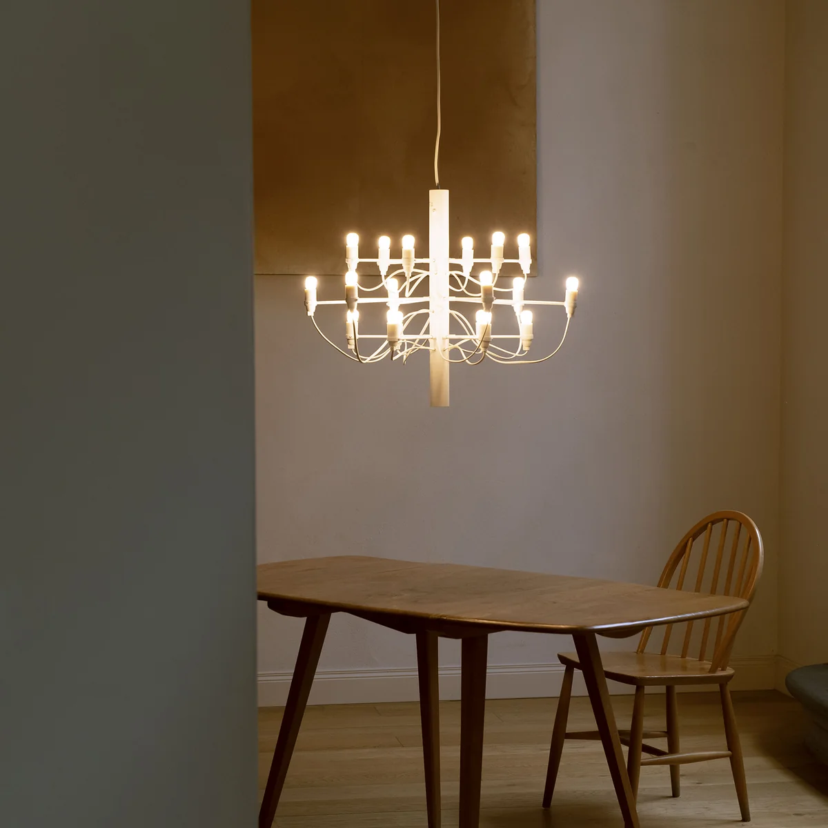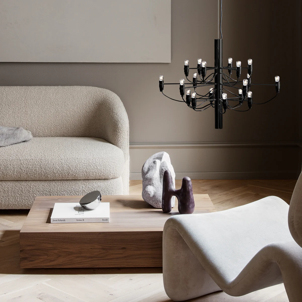Die Glühbirnen befinden sich harmonisch verteilt auf den aus Stahl gearbeiteten Armen des Leuchters und tauchen jeden Raum in sanftes Licht. Anders als viele andere klassische Kronleuchter wirkt der 2097 modern und klassisch zugleich. Der Kronleuchter ist in verschiedenen Grössen und Materialbehandlungen erhältlich.