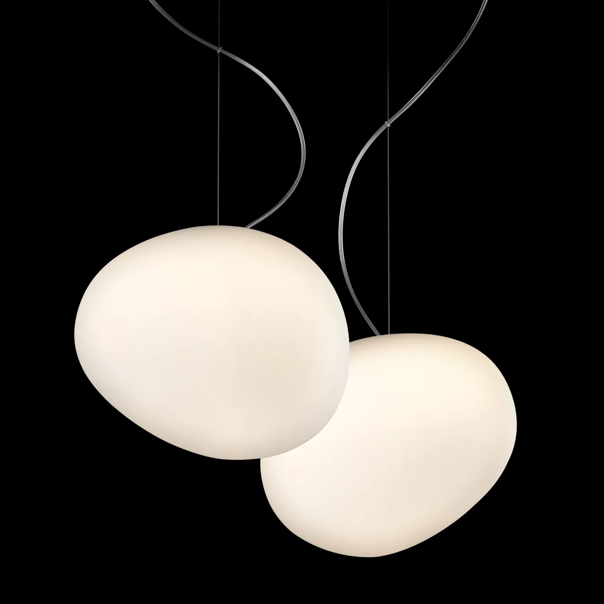 Die Gregg Pendelleuchte LED wurde von den italienischen Architekten und Designern Ludovica und Roberto Palomba entworfen. Die asymmetrische Form, sowie die weiss satinierte Oberfläche erinnert stark an von Wasser geschliffene Kieselsteine. Mit ihrer skulpturalen Silhouette zeigt sich die zarte Leuchte aus jedem Blickwinkel in einer anderen Form, was sie zu einem echten Hingucker macht.