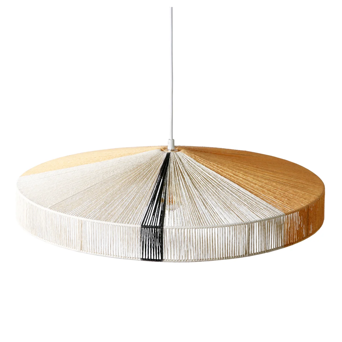 Die Rope Pendelleuchte von HKliving überzeugt durch ihr leichtes Aussehen und die moderne Form. Die Leuchte fällt vor allen Dingen durch den gespannten Schirm aus Seil auf, der in verschiedenen Farben zum Hingucker über dem Esstisch wird.