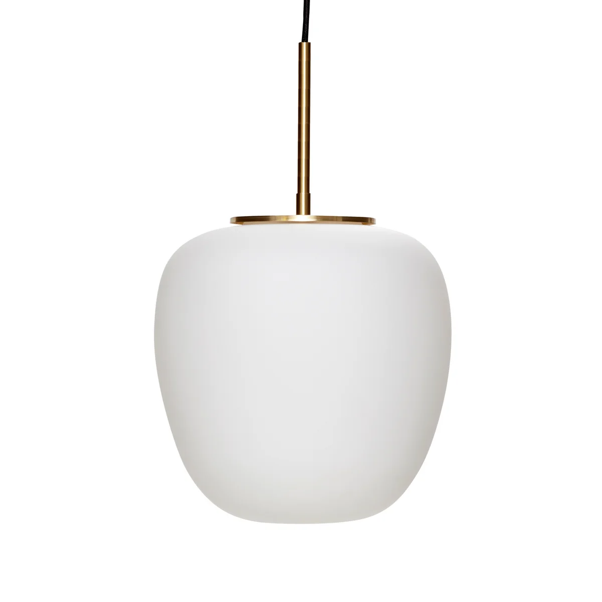 Hübsch Interior stellt die Pendelleuchte aus Glas und Messing her. Sie ist in verschiedenen Formen und zudem mit einem weissen oder verspiegelten Körper erhältlich.