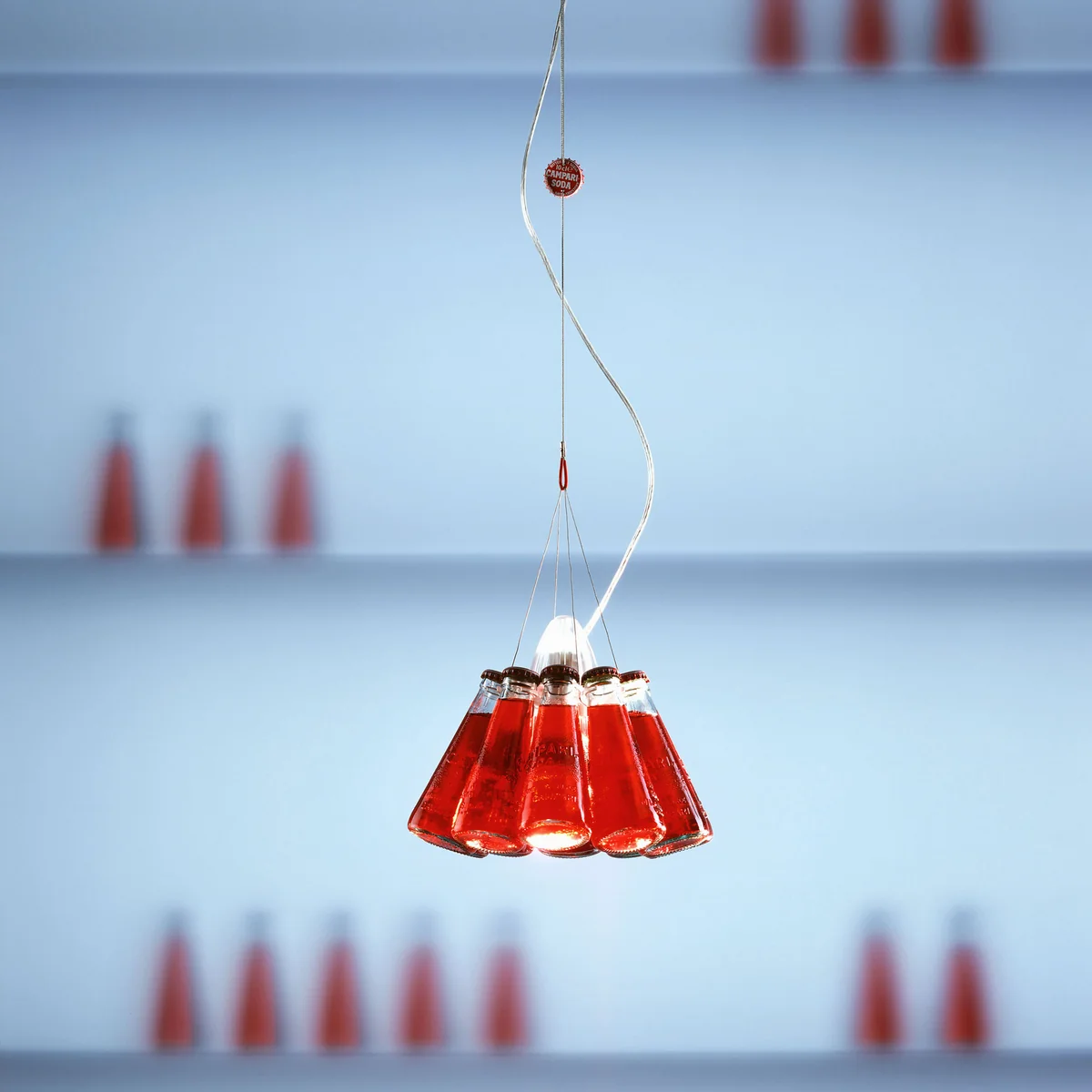 Die farbigen Campari-Flaschen bilden den Leuchtenschirm, in dessen Mitte sich das Leuchtmittel befindet. Das Licht strahlt nicht nur nach unten ab, sondern verbreitet sich auch durch die Campari-Flaschen hindurch. Der Inhalt der Flaschen verleiht dem Licht dabei eine farbige Note. Abgesehen von den bunten Flaschen ist die Konstruktion der Pendelleuchte minimalistisch und reduziert.
