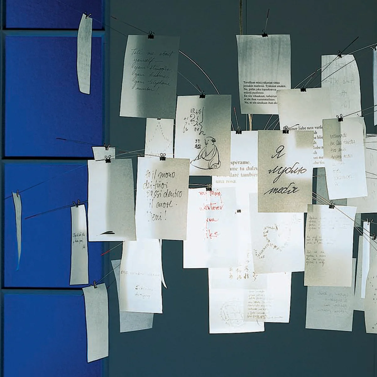 Die Pendelleuchte Zettel’z 5 von Ingo Maurer aus dem Jahr 1997 lässt sich individuell gestalten und beeindruckt mit einem vielschichtigen Spiel von Licht und Schatten.