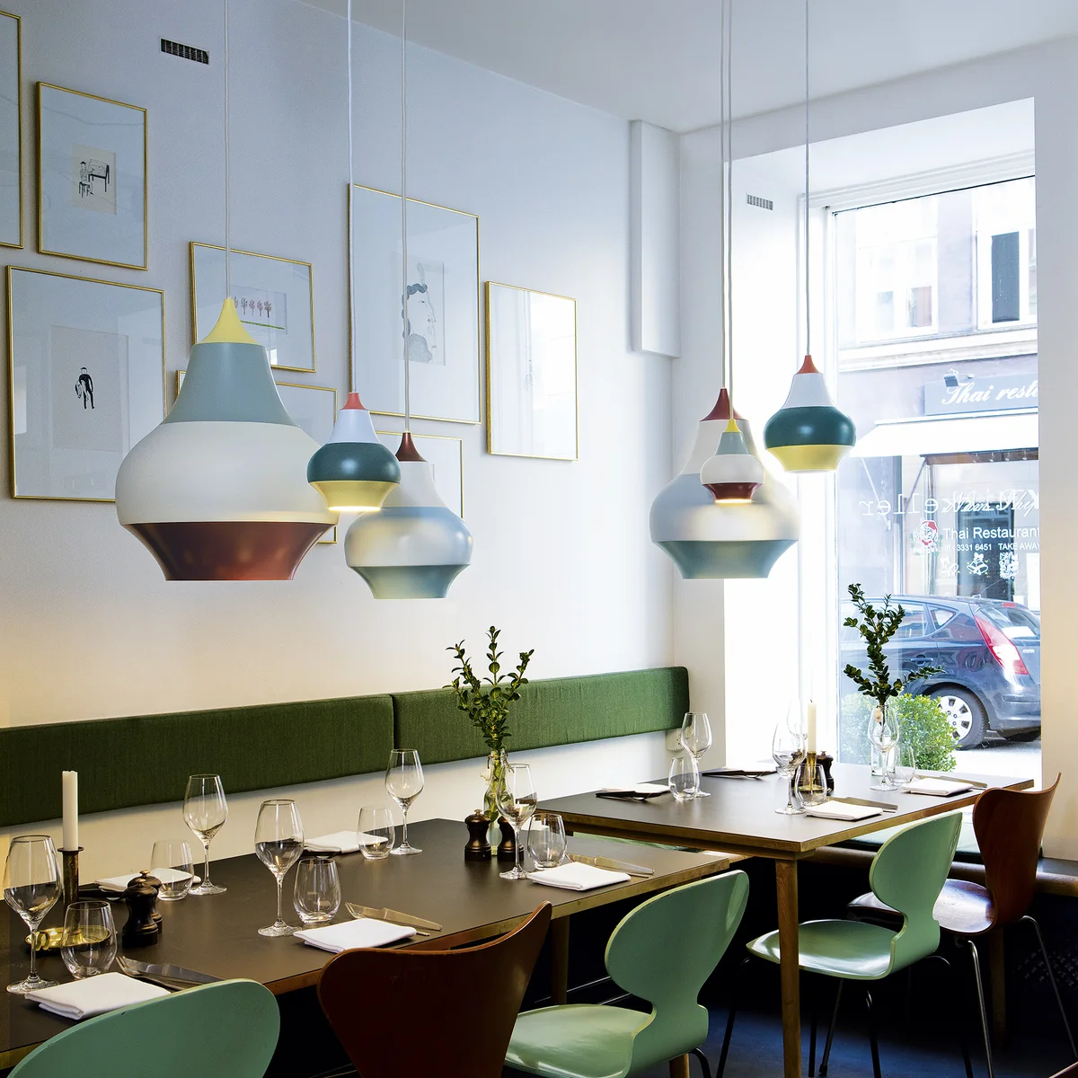 Die Leuchtenserie eignet sich für Restaurants, Cafés und Bars ebenso wie für die heimische Küche oder das Esszimmer. Dank der matt weiss lackierten Innenseite spenden die Leuchten ein weiches, nach unten gerichtetes Licht, das in „normaler“ Höhe blendfrei ist. Dabei eignet sich die Leuchte vor allem zum tieferen Hängen über Tischen oder Tresen, wo sie in unterschiedlichen Varianten farbenfrohe Akzente setzt. Dank E27 Fassung kann die Leuchte mit unterschiedlichen Leuchtmitteln ausgestattet werden, sodass Farbwiedergabe und -temperatur des Lichtes individuell bestimmt werden können.