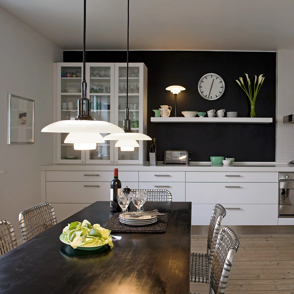 Ein Klassiker unter den Varianten ist die PH 3/2 Pendelleuchte. Sie basiert auf dem Prinzip eines reflektierenden Mehrfachschirm-Systems mit blendfreier Beleuchtung. Die Form der Schirme baut auf einer logarithmischen Spirale auf, in deren Brennpunkt das Leuchtmittel platziert ist. So erzeugt die 3/2 eine weiche Beleuchtung.