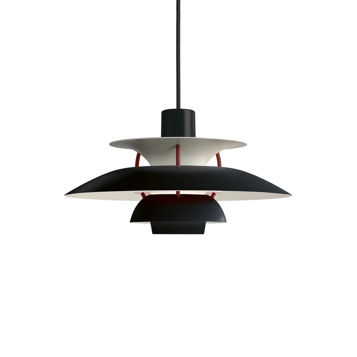 Die PH 5 Mini Black Friday Edition 2025 verkleinert das ikonische Design von Poul Henningsen, ohne Kompromisse bei Qualität und Wirkung. In dieser limitierten Sonderedition präsentiert sich die Leuchte in einer edlen Kombination aus matt lackierten, schwarzen Aluminiumschirmen, weissen Lackdetails und strukturellen Elementen in Monochrome Burgundy. Die kompakte Grösse eignet sich ideal für kleinere Räume, während das dreiteilige Schirmsystem für eine gleichmässige, blendfreie Ausleuchtung sorgt. Ein mattierter Glasdiffusor verfeinert das Lichtbild zusätzlich – stilvoll, zeitlos und funktional.
