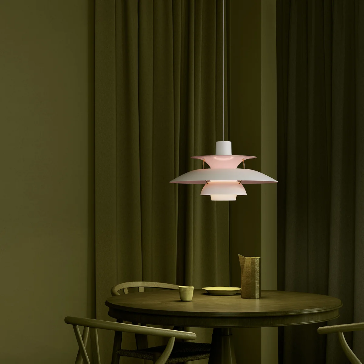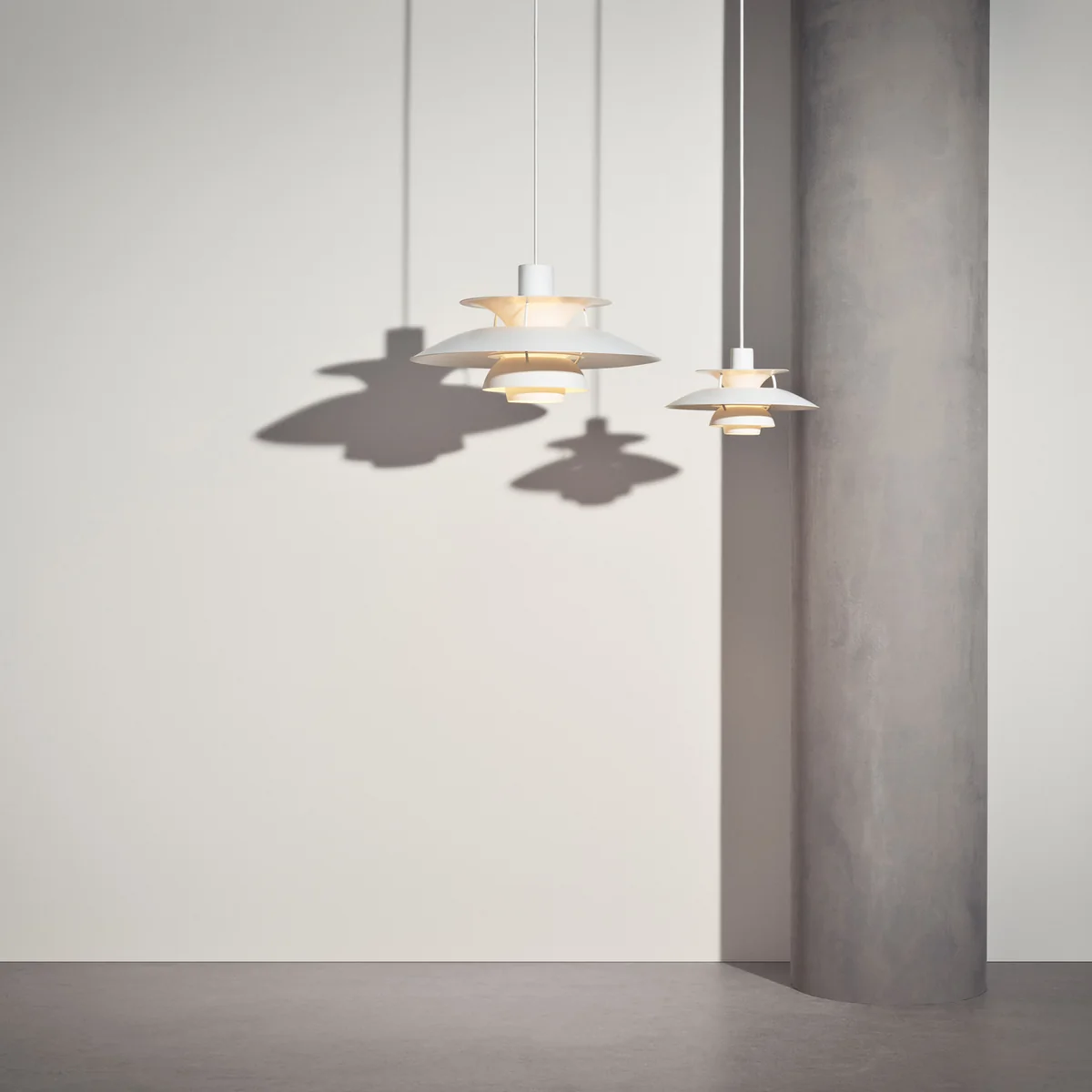 Die PH 5 Pendelleuchte ist Mitglied der PH3-Schirm-Produktfamilie. Das PH 3-Schirm-System war anfänglich eine Pendelleuchten-Lösung, entwickelte sich aber sehr schnell zu anderen Leuchtenarten für Tische, Böden, Wände und einer grossen Anzahl von Kronleuchtern. Als Resultat aus den verschiedenen Grössen, Materialien, Oberflächen und Lichtquellen wurden im Laufe der Jahre über tausend Varianten entwickelt.