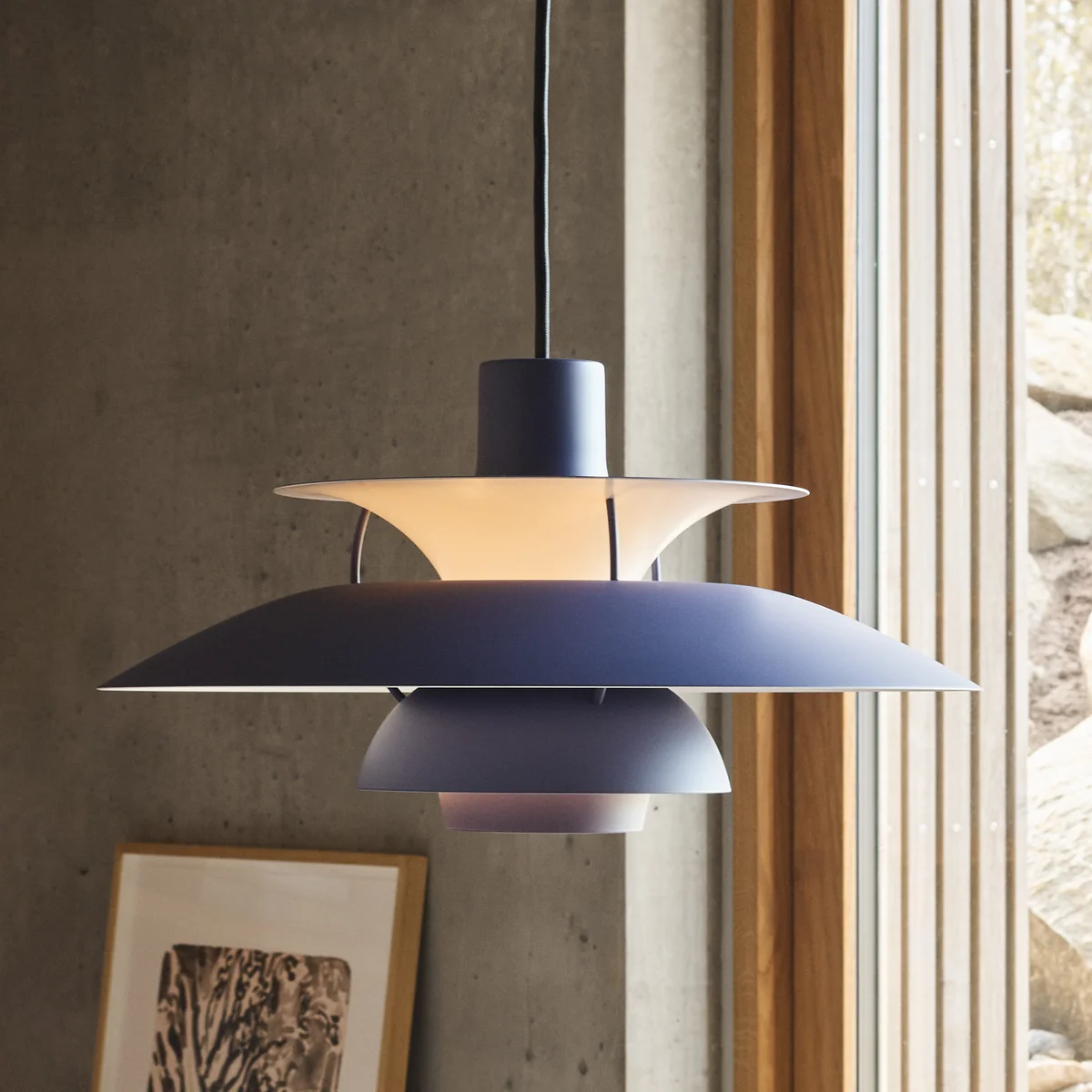 Die PH 5 und ihre jüngeren Geschwister, die PH 50 Leuchten, können tief über den Tisch gehängt werden. Sie setzen sich aus drei Schirmen und einem Kegel auf drei Streben zusammen. Zwei weitere kleinere Schirme verbessern den Spektralanteil des für das Auge kaum wahrnehmbaren Lichts. Durch das Design des sichtbaren Reflektors wird sichergestellt, dass das Licht sowohl vertikal als auch horizontal abgestrahlt wird. Durch ein sandgestrahltes Glas im unteren Schirm ist das Licht diffus.