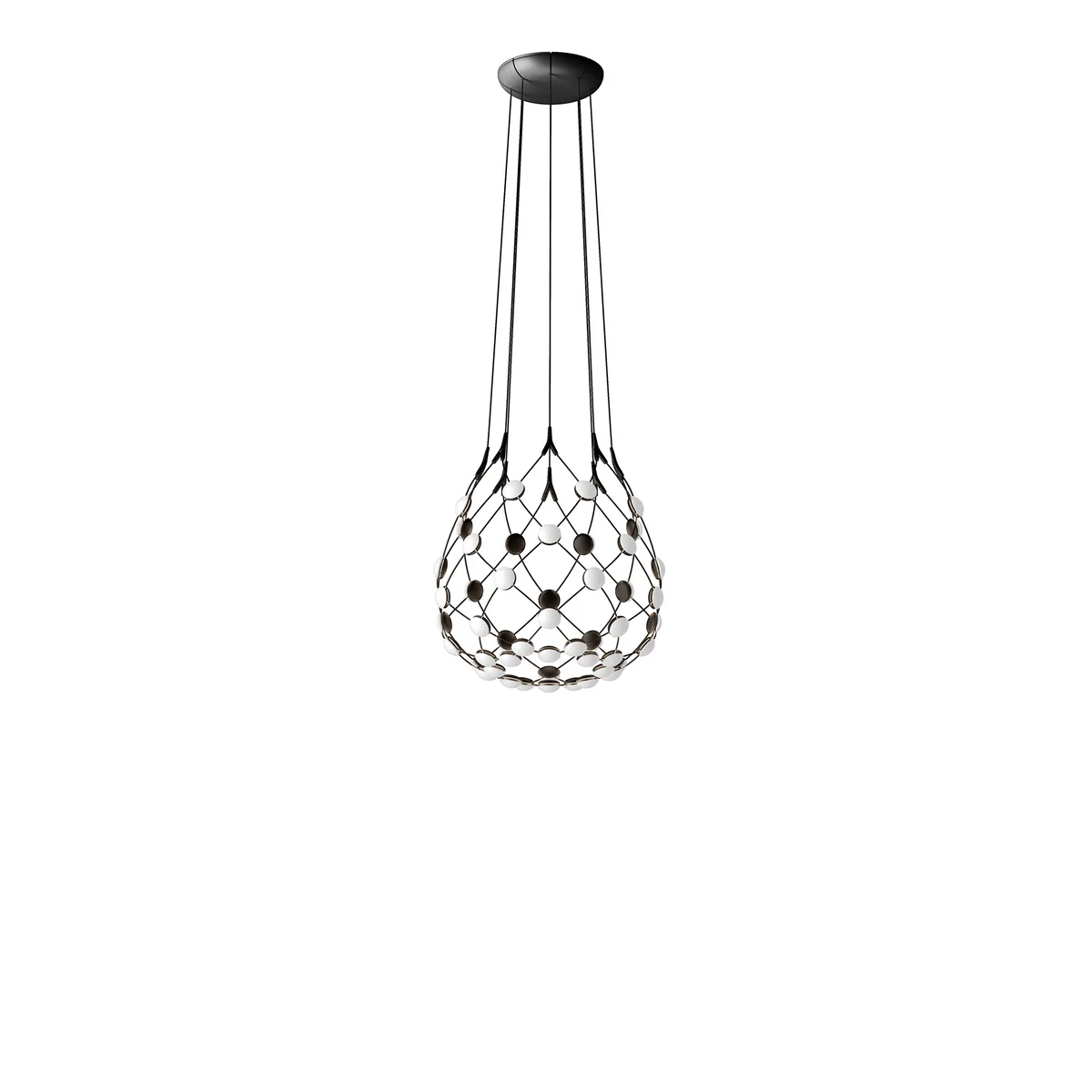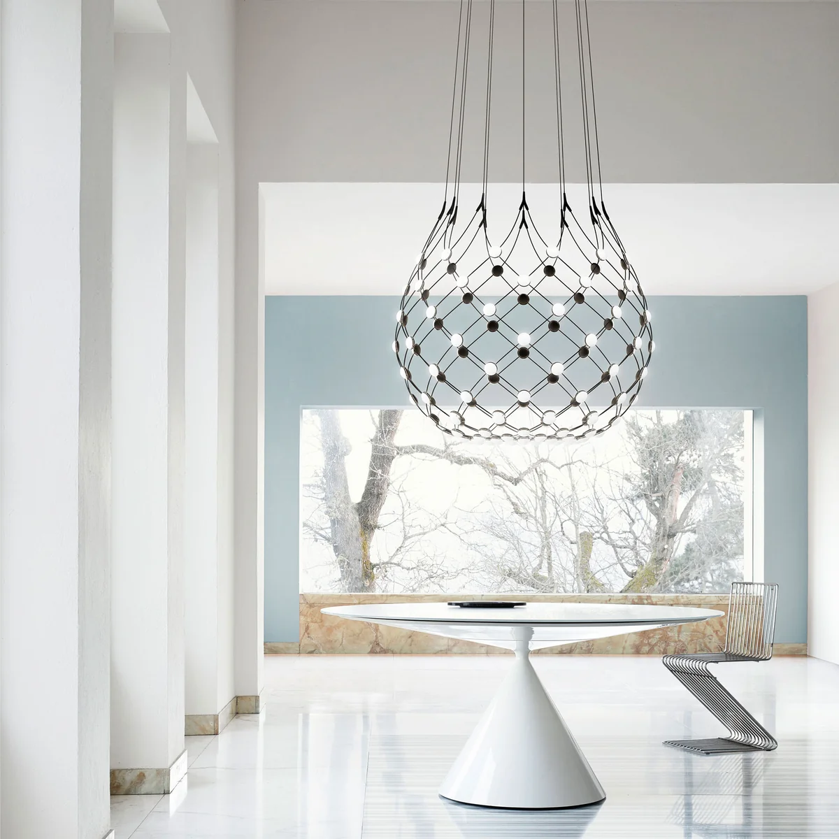 Die leichtfüssige, fast transparente Struktur der Leuchte besteht aus einem Netz aus Metallkabeln, an deren Knotenpunkte LEDs angebracht sind. Das Design konzentriert sich voll und ganz auf die Leuchtquellen. Eine poetische Schöpfung von grosser Wirkung, die es möglich macht, eine raffinierte, stimmungsvolle Atmosphäre im Wohnbereich oder dem öffentlichen Raum zu erzeugen.