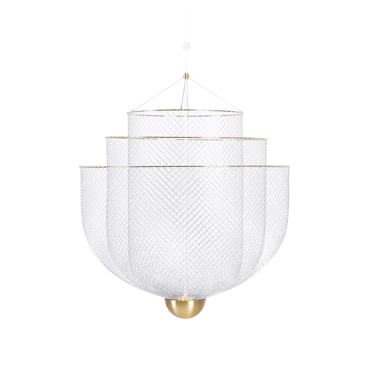 Der Moooi Meshmatics Kronleuchter stammt aus der Feder des Produktdesigners Rick Tegelaar. Das elegante Design des Kronleuchters wurde auf eine ganz kunstvolle Weise umgesetzt. Für seinen Kronleuchter entwickelte der niederländische Designer eine Maschine, die es ermöglicht, das filigrane Drahtgeflecht nach eigenen Wünschen zu formen. Der Leuchtenschirm besteht aus drei dünne Lagen Maschendrahtstruktur, die das Licht aus dem Inneren dieser Leuchte mit schönsten Muster und Schatten an die Wände wirft.
