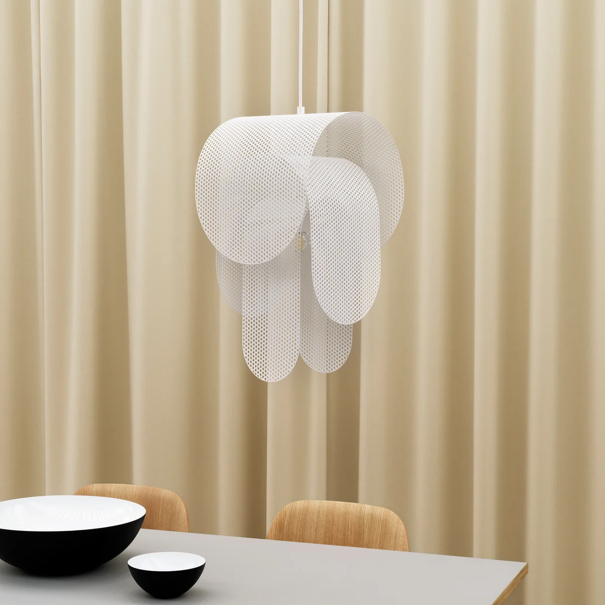 Die Superpose Pendelleuchte von Normann Copenhagen ist eine skulpturale Leuchte des Designers Frederik Kurzweg. Sie besteht aus drei gebogenen, perforierten Stahlblechen, die konzentrisch umeinander angeordnet sind, versetzt in einem präzisen 180 Grad-Winkel.