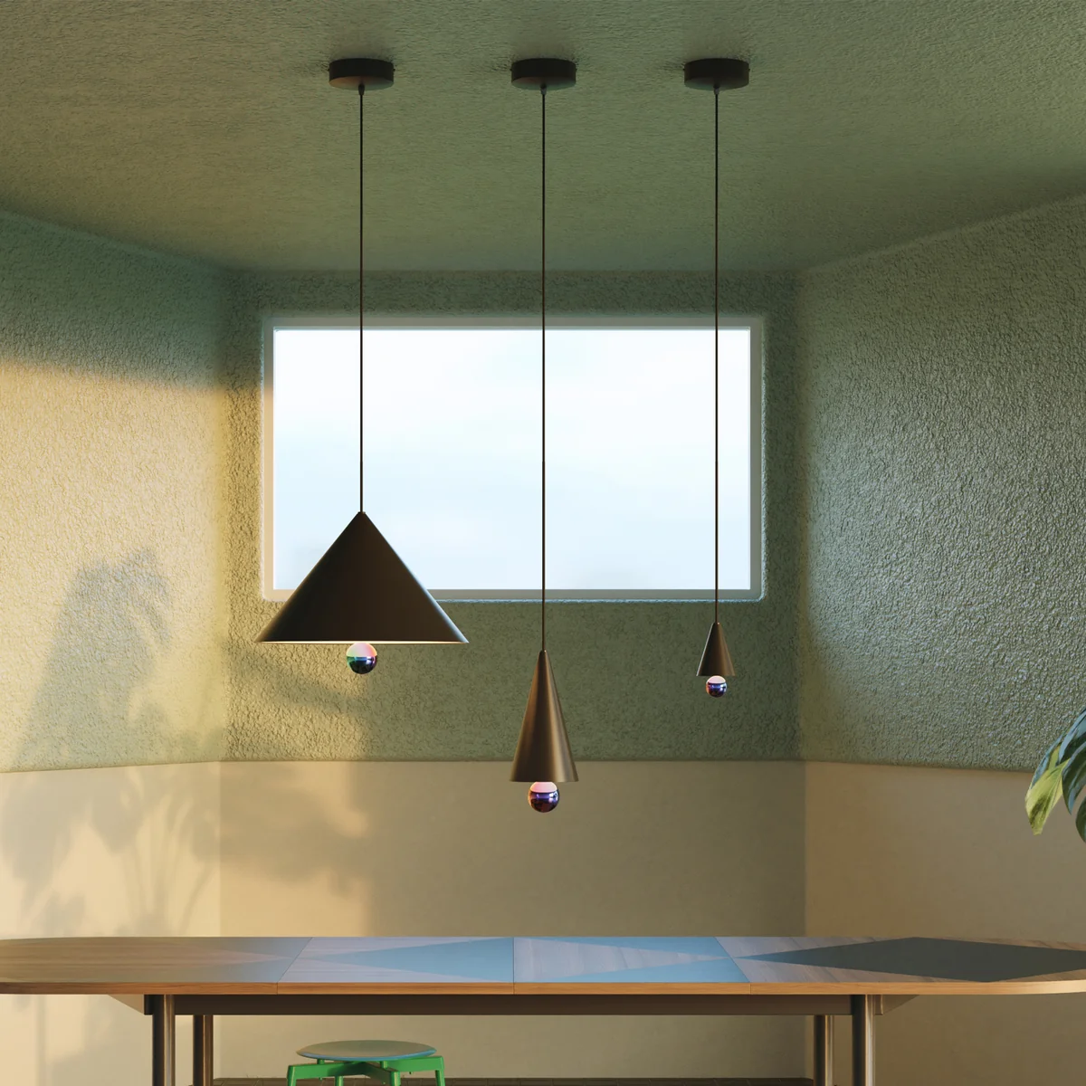 Die Cherry LED Pendelleuchte wurde vom australischen Designer-Duo Daniel und Emma für Petite Friture entworfen. Sie zeigt sich in einem minimalistischen und einfach gehaltenen Design. Die Pendelleuchte besteht aus einem Aluminium-Kegel mit einer schimmernden Kugel am Boden, die das Licht reflektiert und verstärkt. Cherry eignet sich als zusätzliche Beleuchtung im Wohnzimmer oder als ausdrucksstarke Hängelampe über dem Esstisch. In verschiedenen Grössen und Farben kann die LED-Pendelleuchte miteinander kombiniert werden, sodass ein kunstvolles Lampen-Arrangement entsteht.