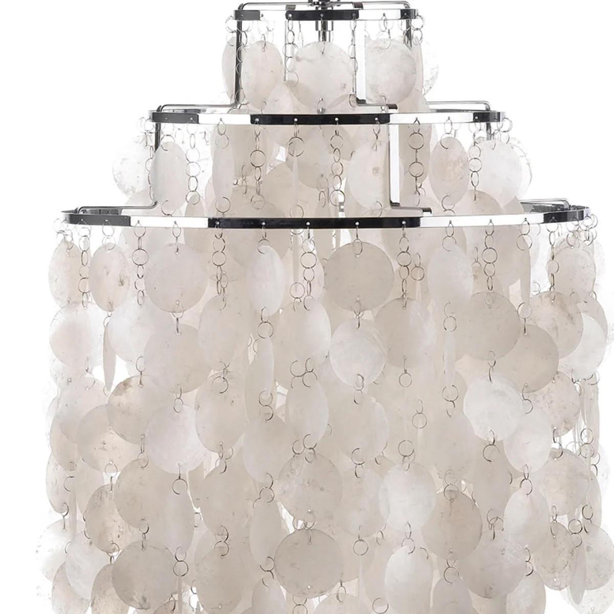 Die Fun 1DM setzt sich aus semitransparenten, runden Perlmuttplättchen zusammen, die durch kleine Metallringe beweglich miteinander verbunden sind: Zu Ketten verschiedener Länge (max. H 60 cm) organisiert, hängen die Plättchen an drei Metallreifen (Ø 45 cm). Die eigentliche Lichtquelle der Verpan-Leuchte ist indes hinter den Plättchen versteckt - wie die Perle einer Muschel.