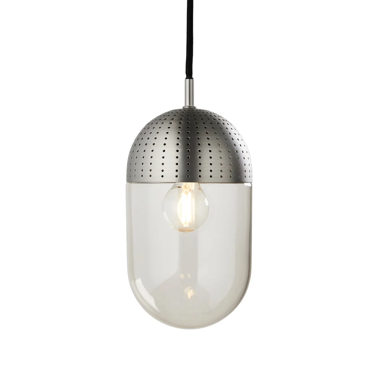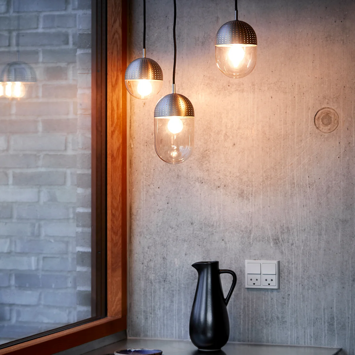 Dot ist eine verspielte Pendelleuchte von Rikke Frost für Woud, die eine gemütliche Atmosphäre in jedem Raum schaffen soll. Kleine Punkte (engl. Dots) im Metallschirm lassen das Licht der Leuchte auf aussergewöhnliche Weise hindurch scheinen.