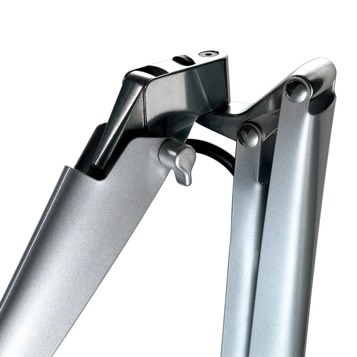 Ein zentrales Gelenk zwischen den Armen der Leuchte gewährleistet grösstmögliche Flexibilität. Die Arme können unabhängig voneinander horizontal und vertikal ausgerichtet werden und so auch extreme Positionen annehmen. Dies erlaubt die Ausleuchtung jedes Winkels sowie das platzsparende Zusammenfahren der Leuchte, die gleichzeitig zur Skulptur wird.