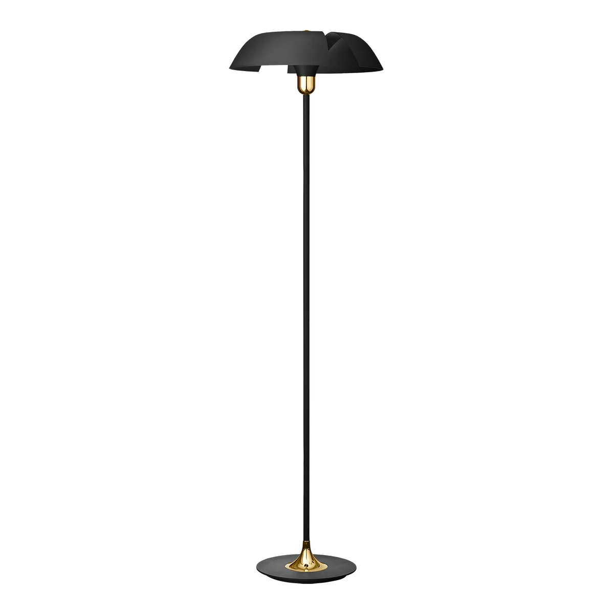 Die Cycnus Stehleuchte von AYTM ist inspiriert von majestätischen Schwänen und wurde mit dem Ziel geschaffen, Licht zu öffnen und einen Effekt zu erzeugen, der an den eleganten Flügelschwung abhebender Schwäne erinnert. Daher wird bei ihr das Leuchtmittel oberhalb des Schirms angebracht, wo es das Licht in die kreisförmige Kuhle rund um das goldene Detail hineinwirft.