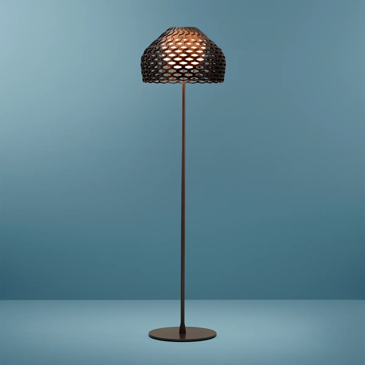 Bei der Tatou Stehleuchte von Flos hat sich Designerin Patricia Urquiola von japanischen Rüstungen inspirieren lassen. So erinnert der wabenartige Lampenschirm an einen Schutzschild, wie ihn beispielsweise ein Gürteltier, auf Französisch „tatou“, trägt.