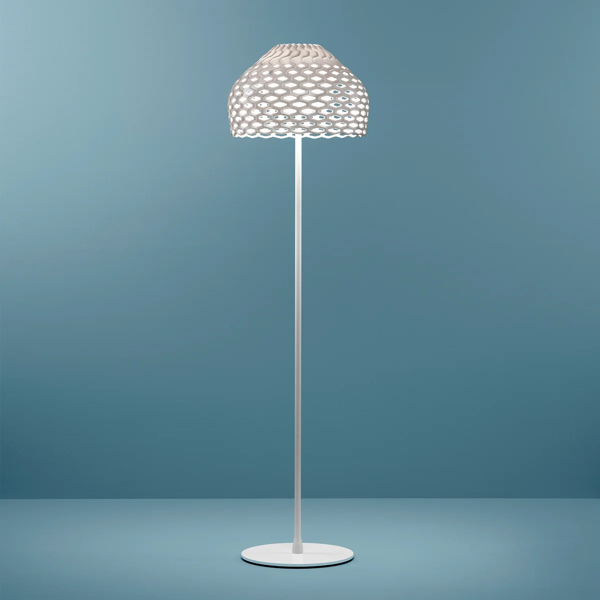 Die Tatou Stehleuchte von Flos besteht aus einem perforierten Polycarbonat-Schirm und einem lackierten Stahlgestell. Sie ist in verschiedenen Farben erhältlich.