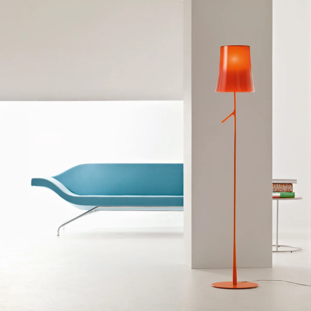 Die klassische Leselampe wurde von Ludovica und Roberto Palomba mit der Birdie Stehleuchte neu inszeniert. Das Besondere an dem Design: Der Leuchtenständer wird zum Boden hin dicker und erinnert in seiner Form und mit dem charakteristischen Seitenast, der gerade einmal Platz für ein kleines Vögelchen (englisch: birdie) bereithält, an einen zierlichen Baumstamm.
