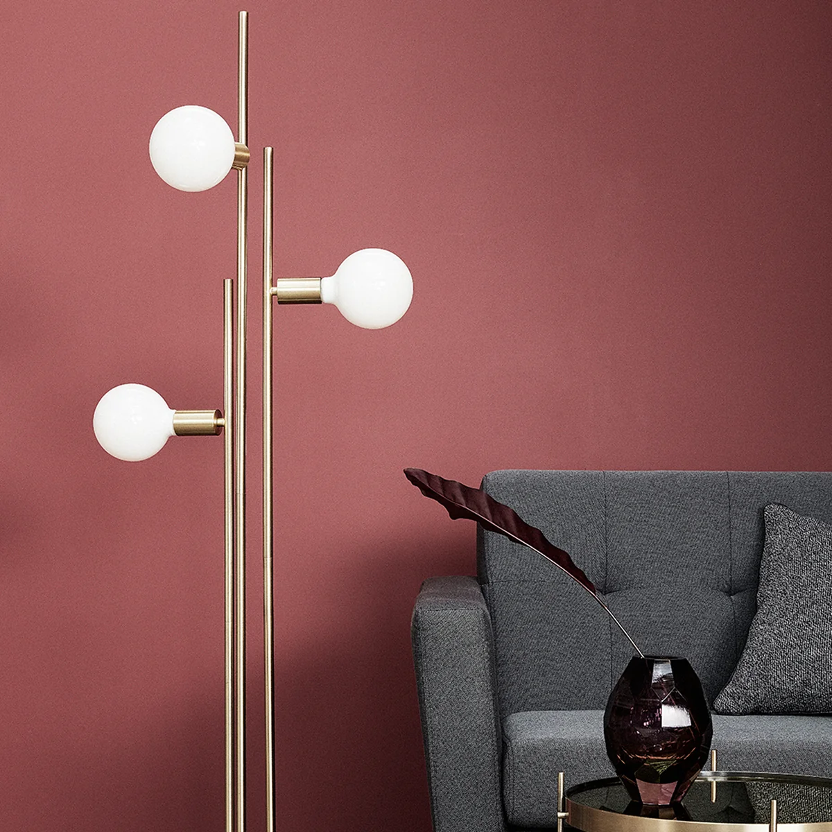 Die 3-flammige Stehleuchte von Hübsch Interior ist eine schlichte und stilvolle Leuchte, die sich mit ihrer klassischen und zeitlosen Form ideal nicht nur im Wohnzimmer platzieren lässt. Drei schlanke Streben aus Messing enden jeweils in verschiedenen Höhen und beheimaten drei runde, minimalistische Lampen, die im rechten Winkel angebracht sind.