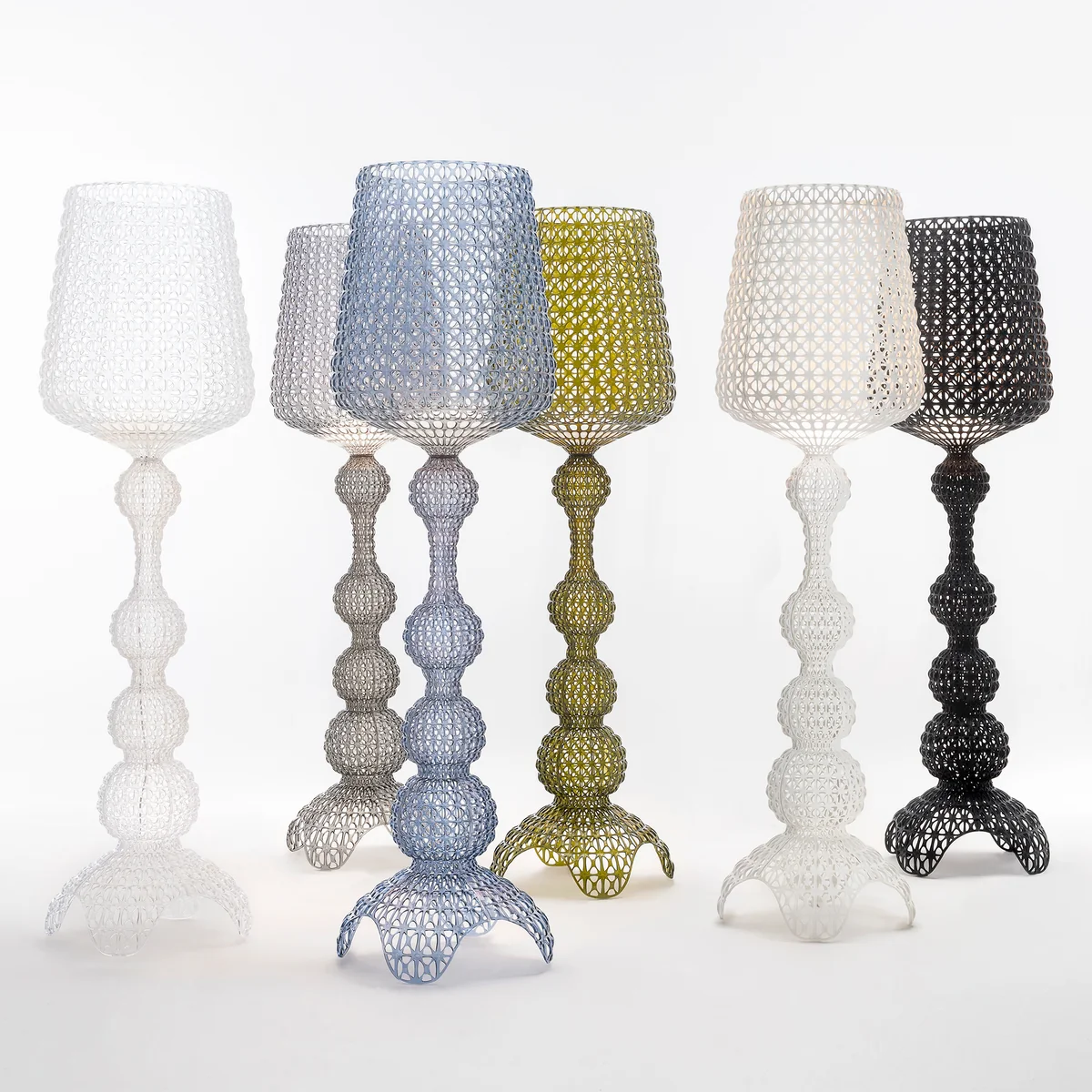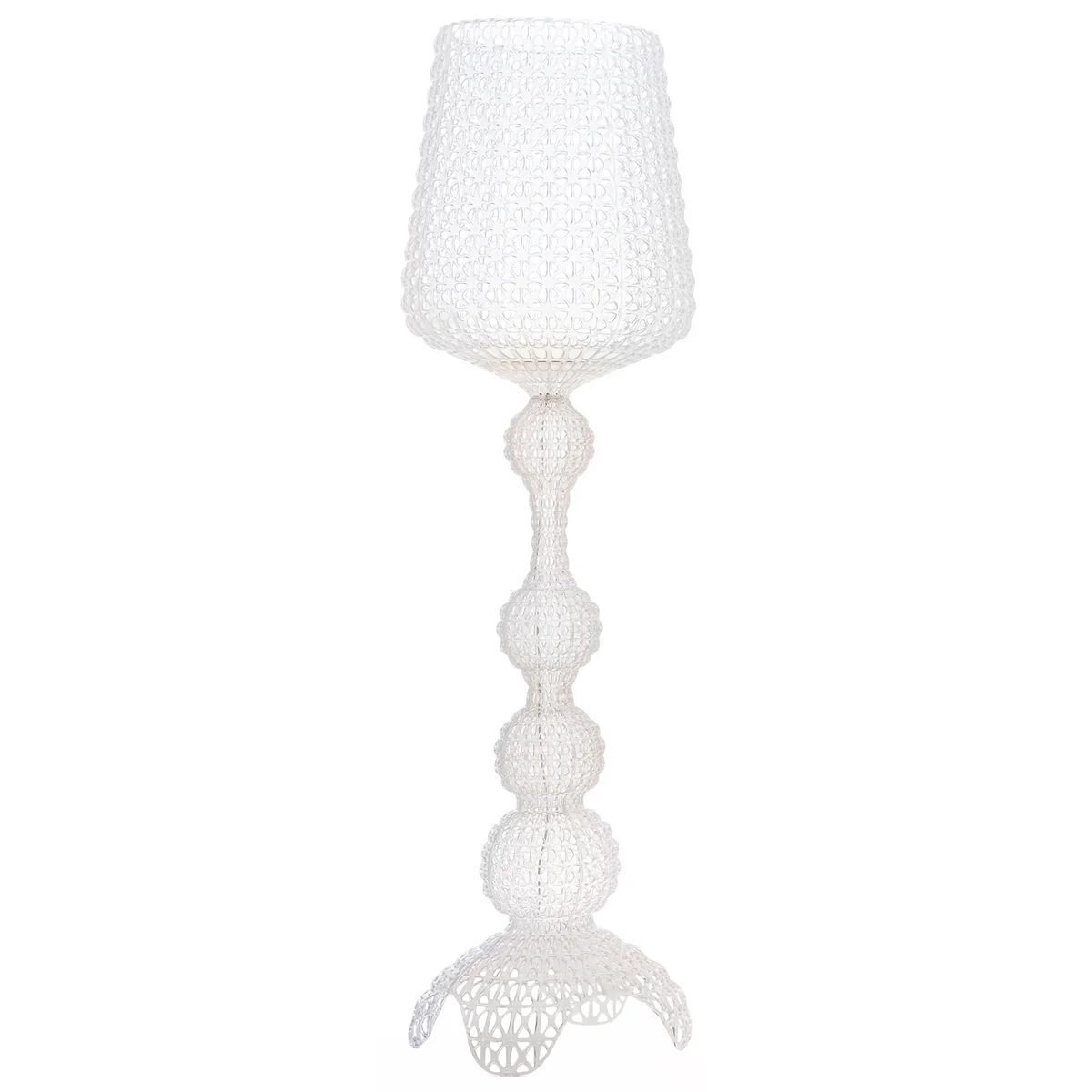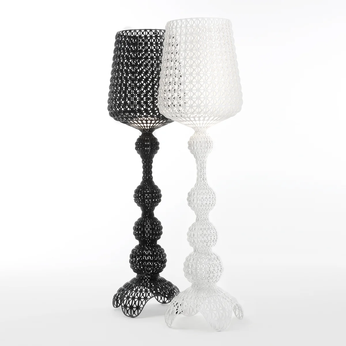Die Kabuki LED Stehleuchte von Pietro Ferruccio Laviani für Kartell ist eine neobarocke Diva im Spitzenkleid. Inspiriert von den ausladenden und detailreichen Dekors des japanischen Kabuki Theaters bringt Laviani seine Ideen mit der modernen industriellen Produktion zusammen und fertigt die Leuchte aus spinndüsengefärbtem und gegossenem Kunststoff.