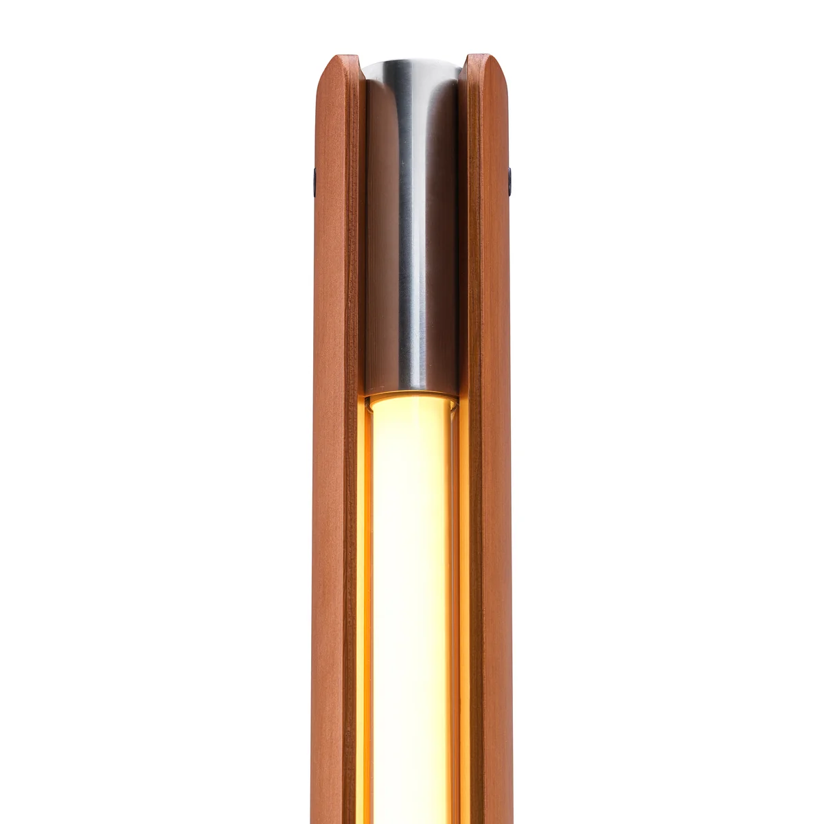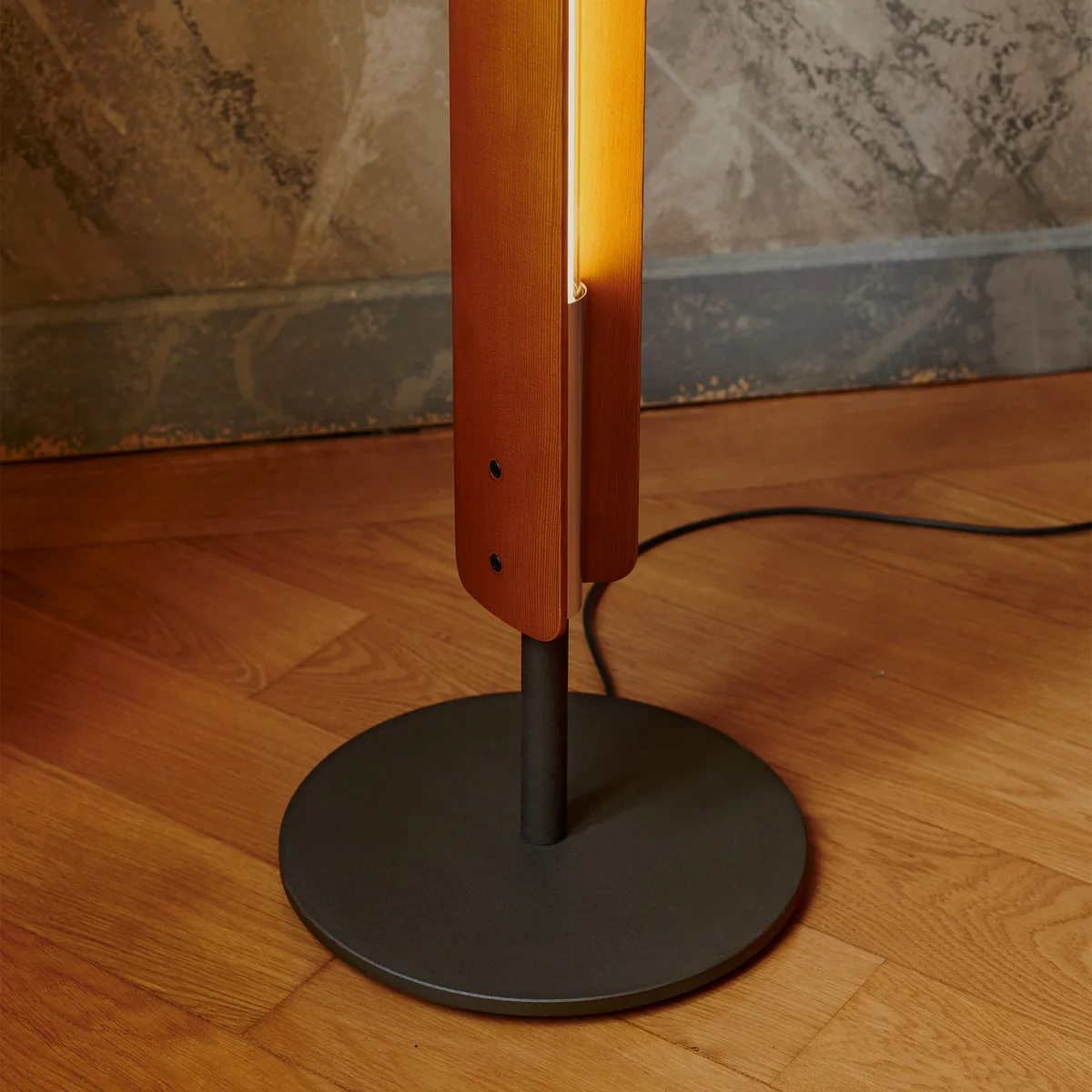 Der robuste Sockel aus rohem, schwarzem Eisen, durch einen filigranen Steg von den Holzflügeln getrennt, verleiht der Stehleuchte Stabilität und skulpturale Ausdruckskraft. Das eigens entwickelte, dimmbare LED-Leuchtmittel bietet weiches, stimmungsvolles Licht und kann alternativ durch handelsübliche T8 LED-Röhren ersetzt werden. Inspiriert von traditionellen Schiffbau-Techniken, reflektiert die Seki-Han Floor Scarpas tiefes Verständnis für Materialien, Proportionen und Handwerk – ein poetisches Lichtobjekt, das Wärme, Präzision und Zeitlosigkeit verbindet. Auch erhältlich als Pendelleuchte.