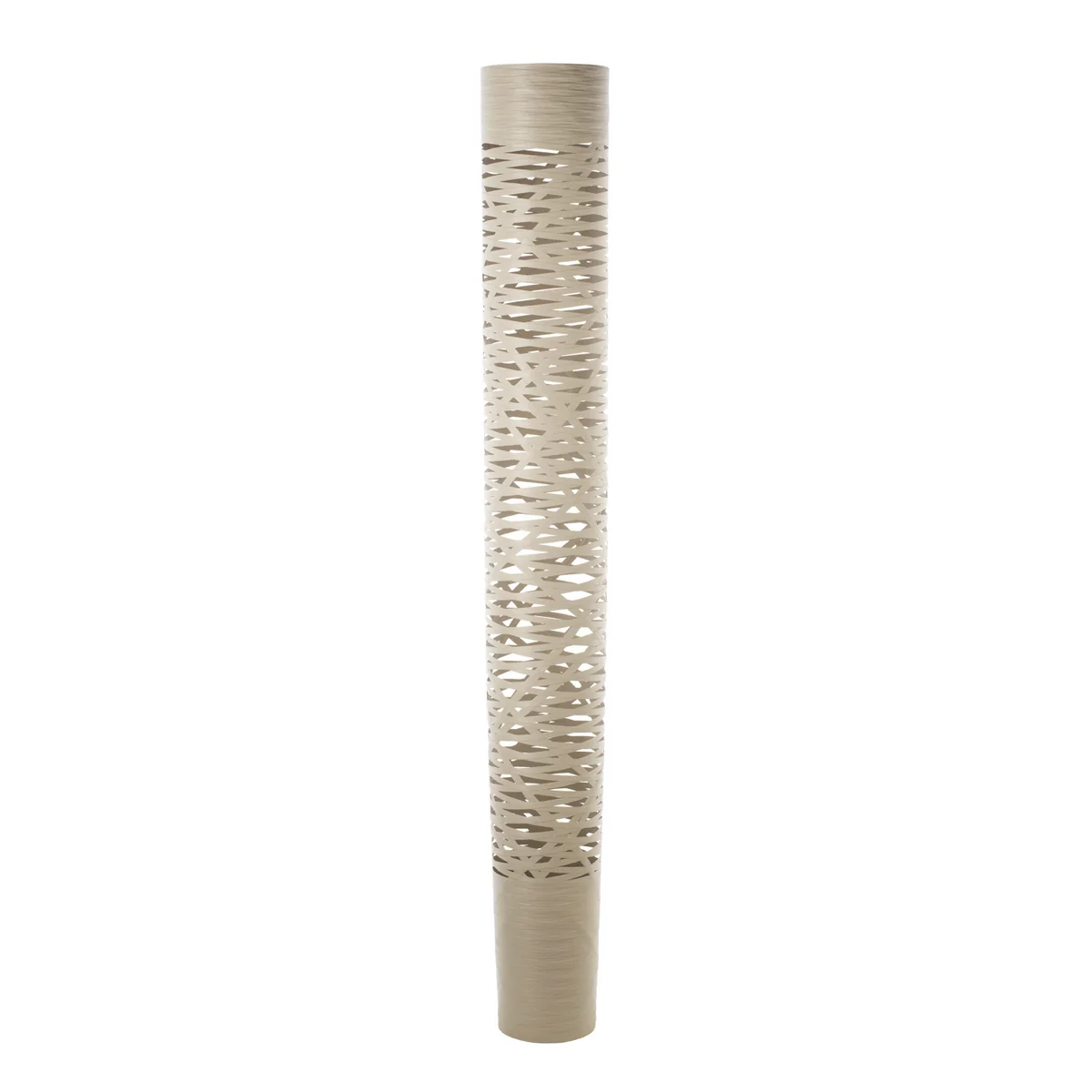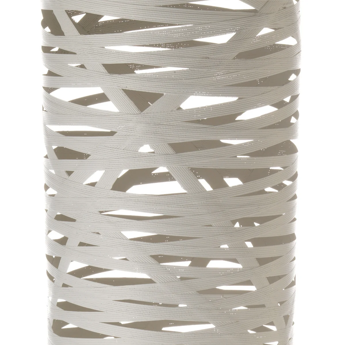 Das Design der Tress Bodenleuchte setzt sich aus in zufälliger Reihenfolge verflochtenen Steifen aus Fieberglas und Kunstharz zusammen, die in Kombination ein willkürliches Netz ergeben. In das Netz, das ein Wechselspiel verschiedener Flächen ist, ist das Stromkabel eingewoben, das sich so als immanenten Teil der Leuchte präsentiert.