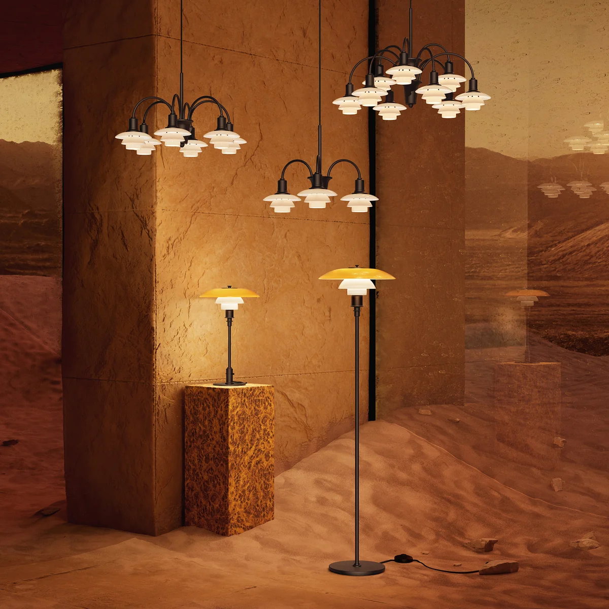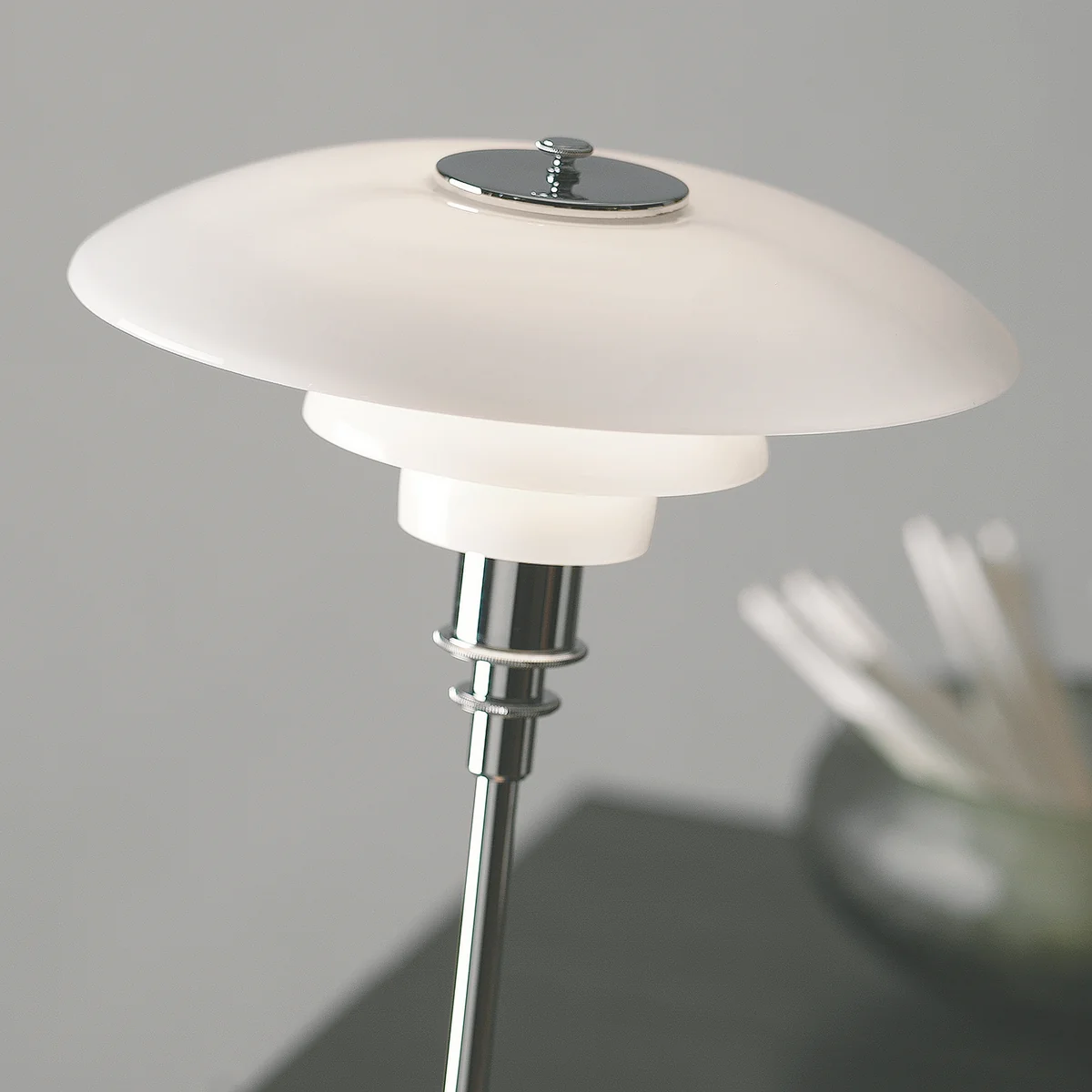 Der Leuchtenschirm wurde ausgehend vom Prinzip eines reflektierenden Dreischirmsystems gestaltet, sodass der grösste Teil des Lichtes nach unten geleitet und so blendfrei abgegeben wird. Aus mundgeblasenem, opalisiertem Glas gefertigt und mit einer matten Innenseite versehen, fördert die Leuchte eine diffuse Lichtverteilung. Damit ist die Louis Poulsen Stehleuchte ein willkommener Begleiter im Wohnbereich, wo sie neben dem Sofa oder Sessel für eine wohnliche Atmosphäre sorgt.