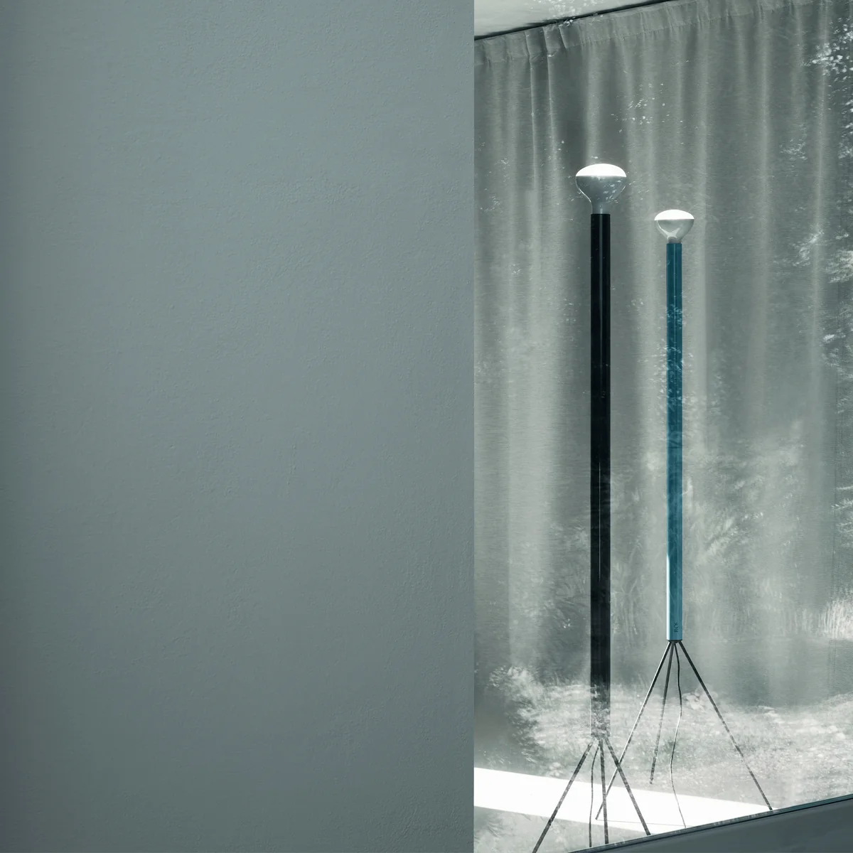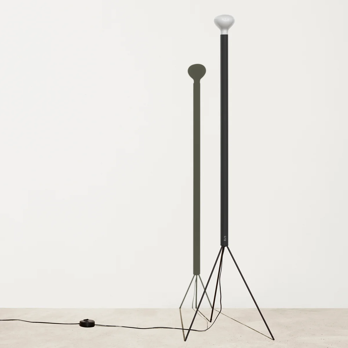 Die Stehleuchte für indirektes Licht benötigt ein 200W / E27 Reflektorleuchtmittel. Der Schaft besteht aus emailiertem, gesintertem Eisen, die Füsse aus flüssiglackiertem Metall.