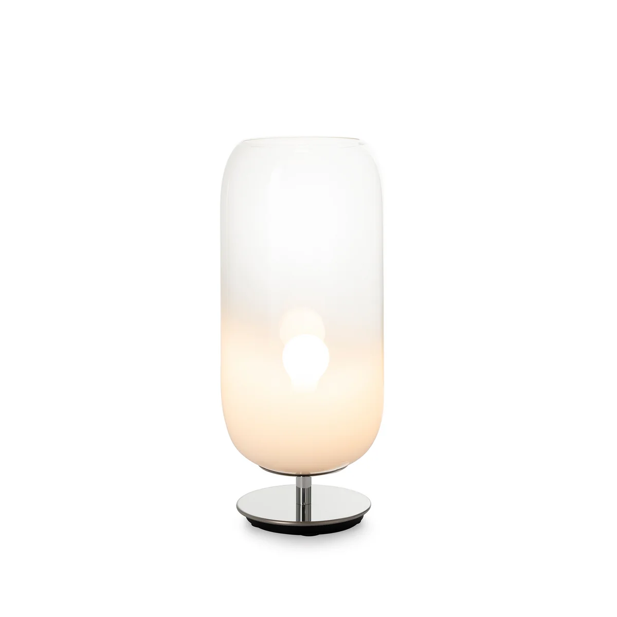 Die Gople Mini Tischleuchte von Bjarke Ingels für Artemide fasziniert durch einen wunderschönen Farbverlauf und ihre fliessenden Formen. Das aus Glas hergestellte Designobjekt spendet diffuses, angenehmes Licht im Schlafzimmer oder Wohnzimmer und dient gleichzeitig als dekorativer Blickfang auf Nachttischen oder Couchtischen. Nach einer alten, venezianischen Tradition wurde diese Leuchte aus weissem Glas und Kristallglas mundgeblasen, sodass jedes Exemplar einzigartig ist. Den finalen, glänzenden Touch erhält die Tischleuchte durch eine innovative Vakuummetallisierung.