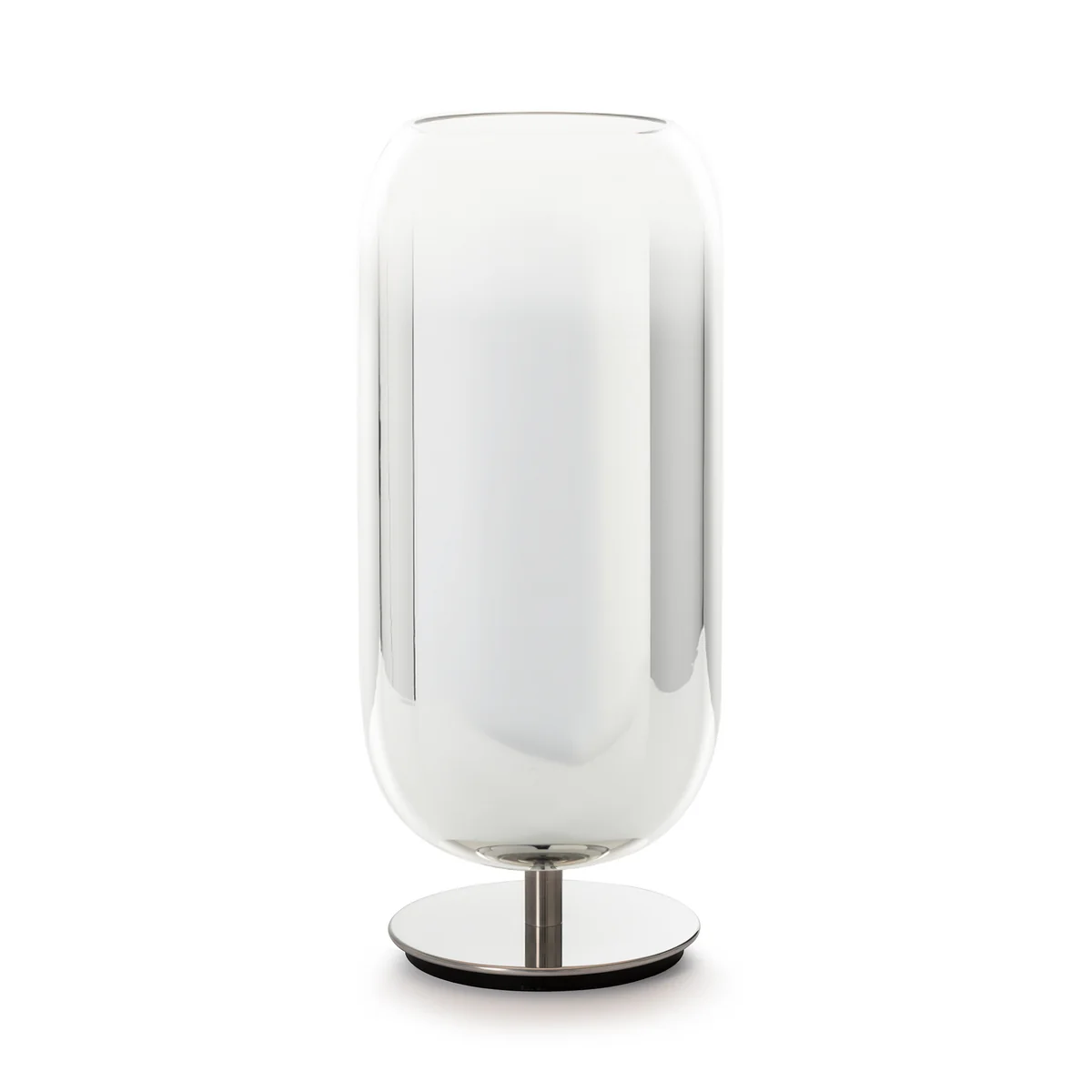 Die Gople Tischleuchte von Artemide fasziniert durch einen wunderschönen Farbverlauf und ihre fliessenden Formen. Das aus Glas hergestellte Designobjekt spendet diffuses, angenehmes Licht im Schlafzimmer oder Wohnzimmer und dient gleichzeitig als dekorativer Blickfang auf Nachttischen oder Couchtischen. Nach einer alten, venezianischen Tradition wurde diese Leuchte aus weissem Glas und Kristallglas mundgeblasen, sodass jedes Exemplar einzigartig ist. Den finalen, glänzenden Touch erhält die Tischleuchte durch eine innovative Vakuummetallisierung.