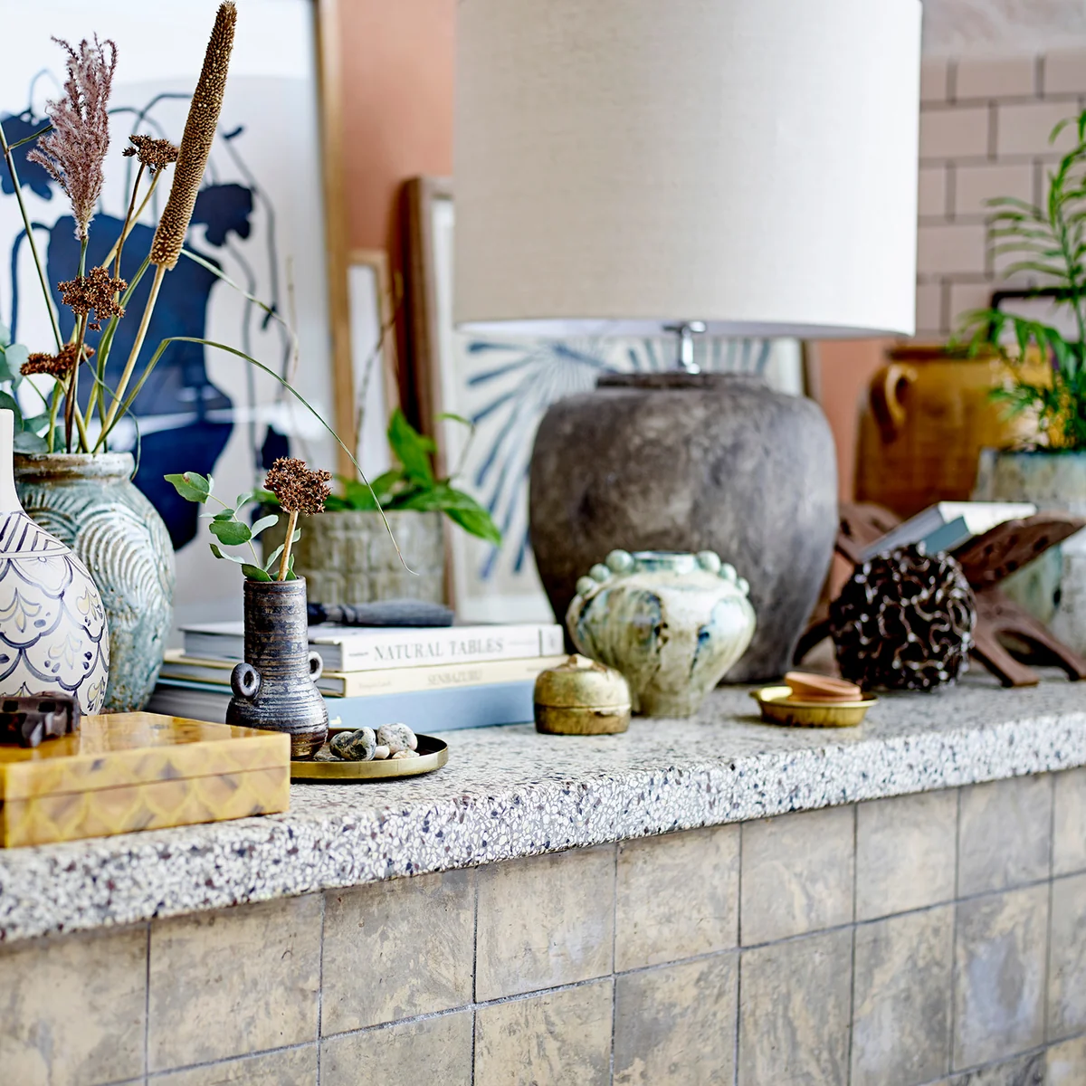 Die Tischleuchte Isabelle von Bloomingville ist mit einem schönen Fuss aus Steinzeug in einem rustikalen Vintagelook gefertigt.