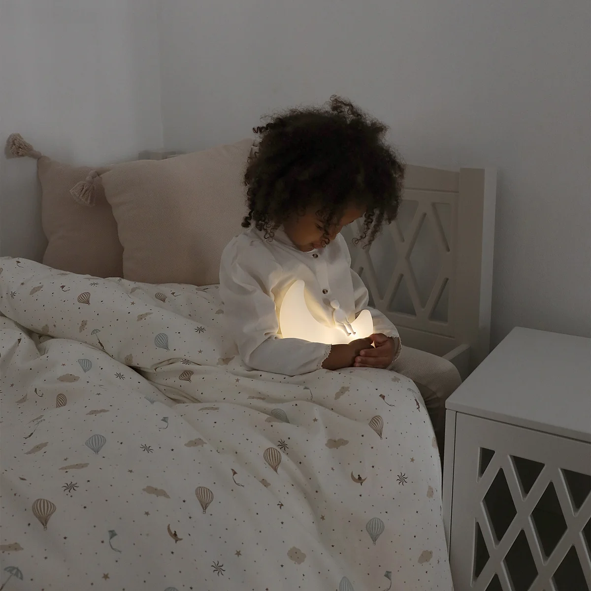 Die Moon Akku-Tischleuchte des dänischen Herstellers Cam Cam Copenhagen begeistert mit seiner aussergewöhnlichen Optik. Das Nachtlicht sorgt mit seinem warmen, sanften, seichten Licht für eine verträumte Atmosphäre im Kinderzimmer. Moon kann wunderbar auf dem Nachttisch neben dem Bett oder auf dem Wickeltisch platziert werden. Die Leuchte lässt sich einschalten, indem der Knopf unterhalb der Lampe gedrückt wird. Durch sanftes Antippen wechselt die Akku-Tischleuchte ihre Farben. Durch nochmaliges Tippen leuchte die aktuelle Farbe weiter, ohne zu wechseln.
