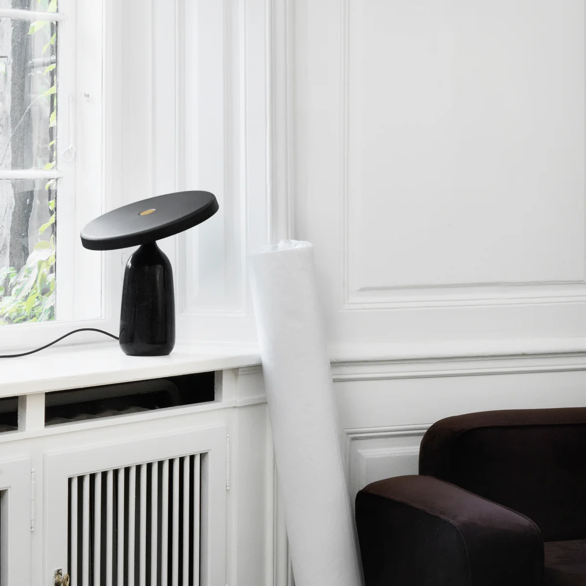 Die Eddy Leuchte von Simon Legald für Normann Copenhagen ist ein wahrer Balanceakt. Ein kreisrunder Schirm aus gepresstem Stahl schwebt leicht und beweglich über der weich geformten Basis aus massivem Marmor und sorgt so für ein Design voller Balance und Bewegung.